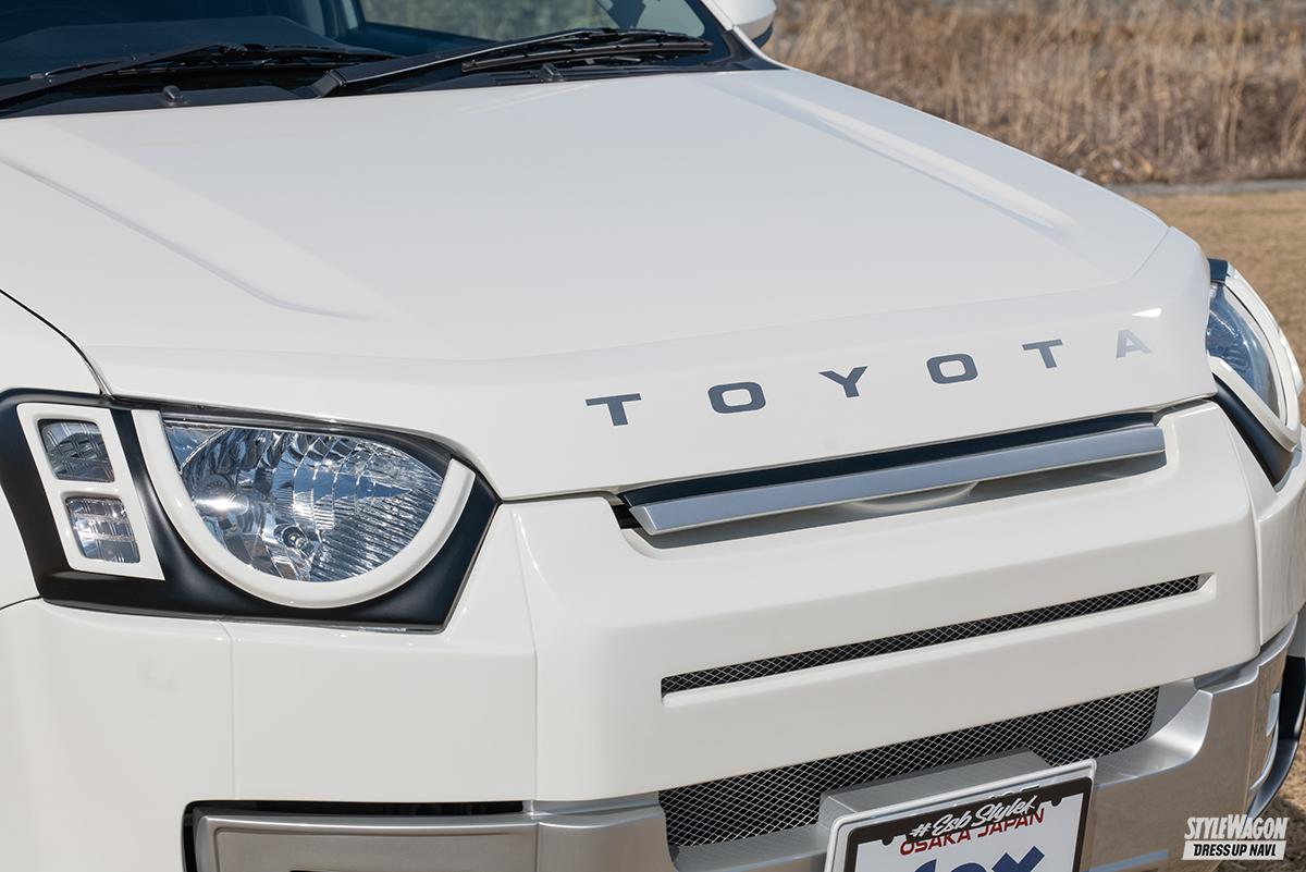 開発のキッカケはアゲたプロボックスがどことなくディフェンダーに近いと感じたられたこと。旬のアゲプロボックスだがスタイルのバリエーションは決して多くはなく、そんな中で映え度バツグンなこのディフェンダールックは目立ち度も最強。パーツ構成がシンプルだから、ここからさらなる深化も狙いやすく、自分流の味付けができる余地が残されるのも魅力的。ライバルに差を付けらたいのなら、ぜひ。
