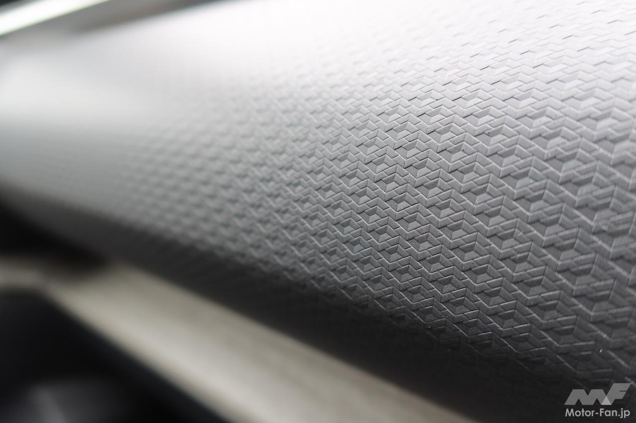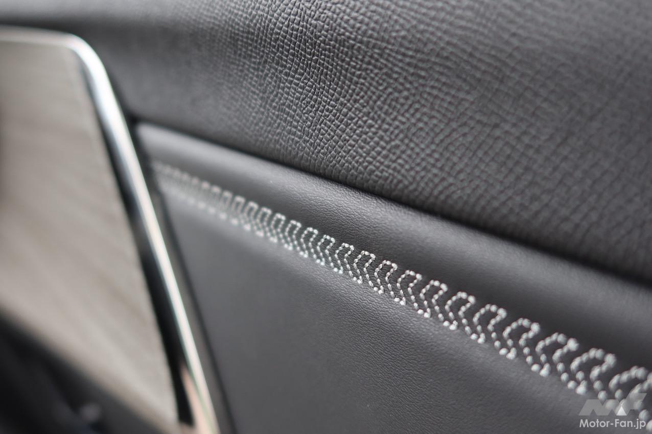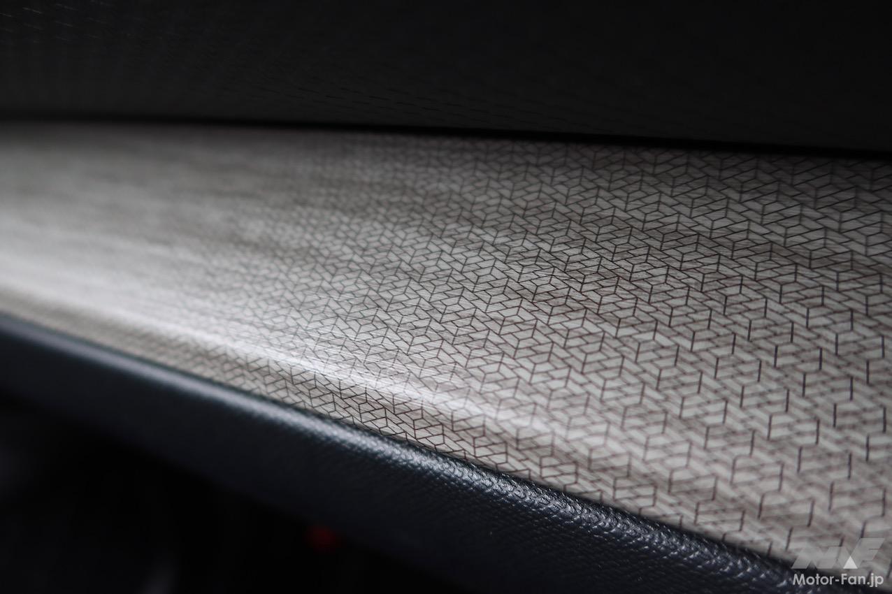 ダブルシェブロンのパターンはインストルメントパネルとその下の木目調パネルにも施されており、ドアトリムにはシートの肩口と同様に連続パターンのダブルシェブロンが刺繍されている。見渡す限りダブルシェブロンのオンパレードだが、映画のキャラクターで満たされたホテルの一室のような暑苦しさはなく、上質なおもてなしの心づかいを感じる。とくに、光の加減で表情を変えるシートのパターンは秀逸だ。