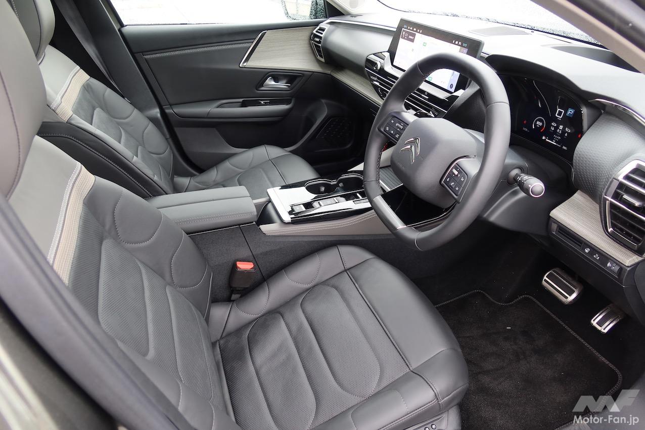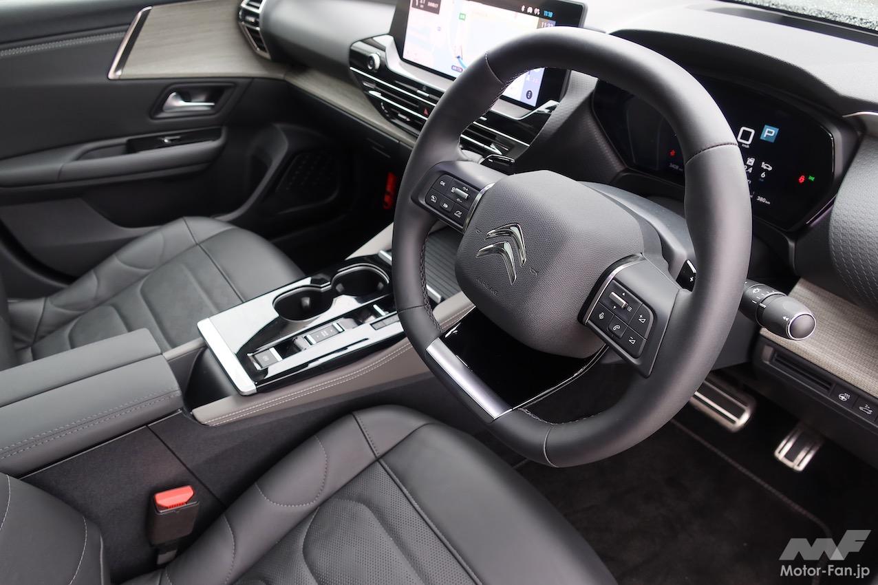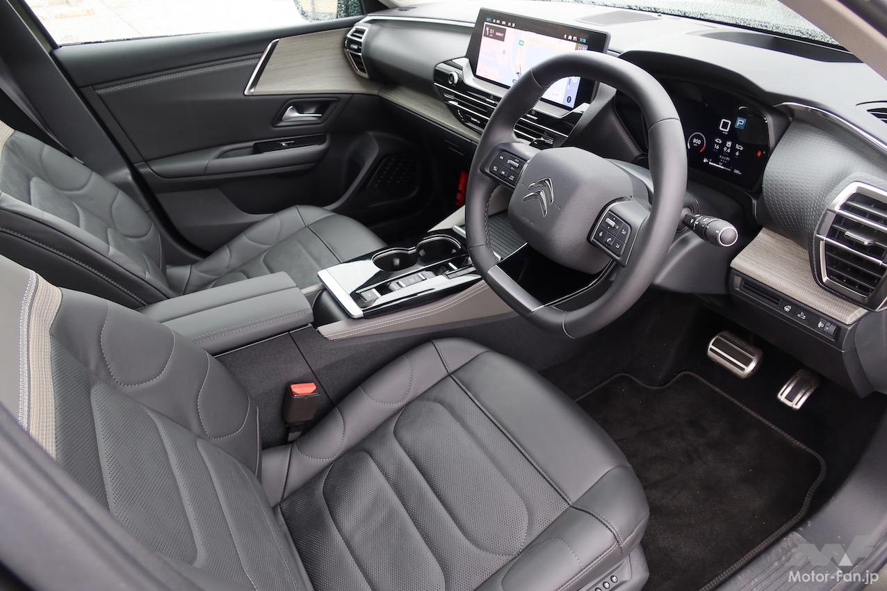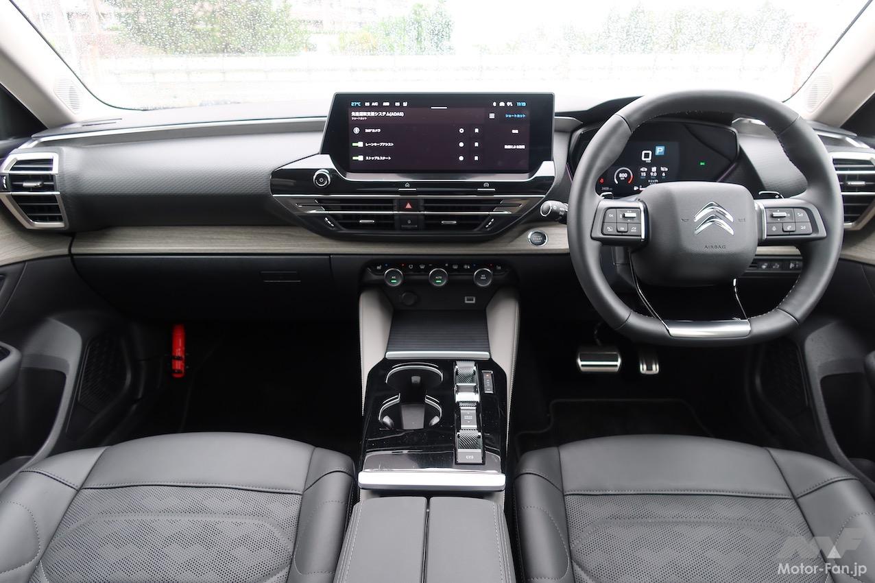上下をカットした変形スポークに四角いホーンパッドを組み合わせたステアリングホイールと、黒い縁取りが際立つ大型のタッチスクリーンはC4と共通したデザインだ。センターの空調吹き出し口やエアコンの操作系、コンパクトにまとまったシフトセレクターもC4と共通である。タッチスクリーンはフラッグシップらしく、C4の10インチに対して12インチと大型だ。