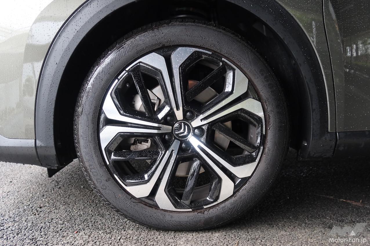 ボディサイズの割に細いタイヤ(205/55R19)を装着するのは昨今のシトロエンのスタイルで、C4も同様(195/60R18)。スタイリング上重要なのはサイドビューで、だったら大径ホイールを装着しておけばいいという割り切りを感じる。コーナーを攻めるような走り方を重要視しなければ、ファットなタイヤを選択する必要はない。接地面積は幅ではなく周方向で確保する考えだ。タイヤ幅が狭ければ空気抵抗の低減に効き、燃費にも好影響を与える。