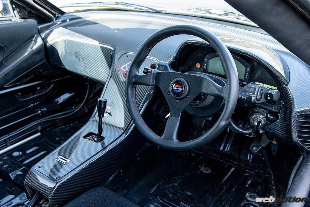 レーシングカーらしくシンプルなインテリア。シートはもちろんダッシュボードもフルドライカーボン製で、不必要な内装パーツは全て撤去。徹底的に軽量化を敢行しているのだ。ステアリングハンドルはスプーンオリジナル、メーターはAIM製のデータロガーに置き換えられている。