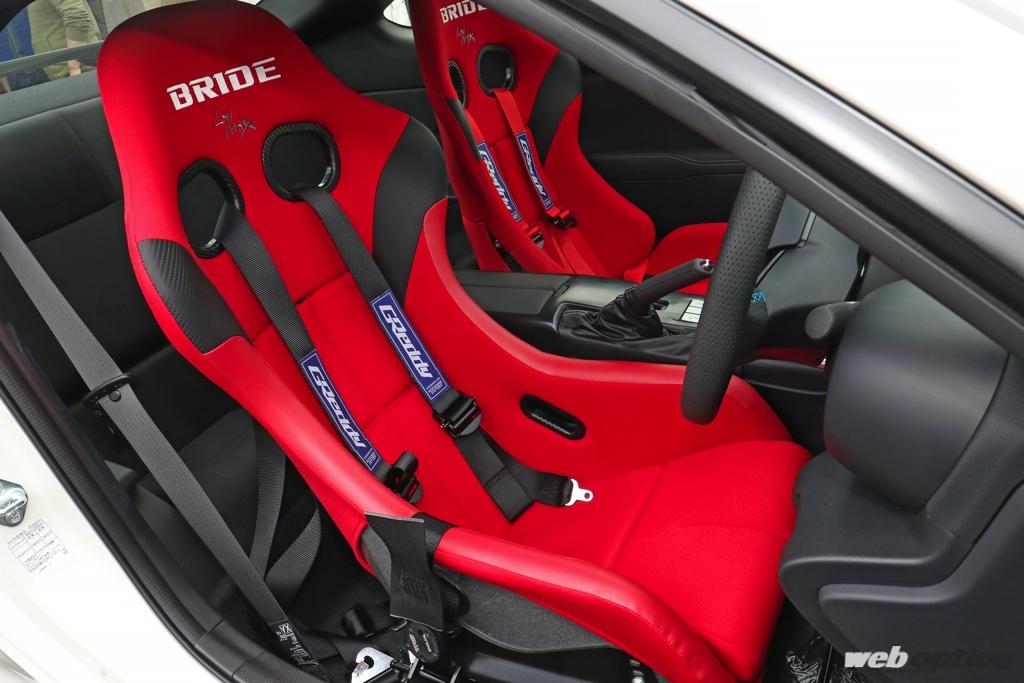 室内はストリート仕様そのもの。ブリッドのフルバケでホールド性を高めた上、試作のGReddyステアリングやシフトノブでドレスアップ済み。