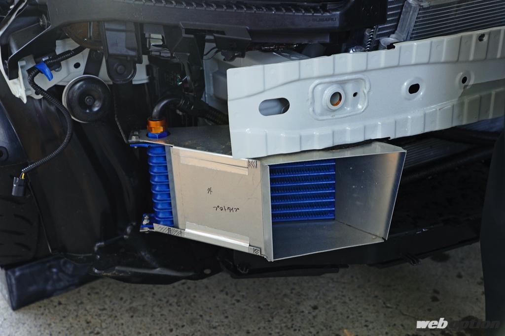 新型GR86は純正で水冷式オイルクーラーを採用しているが、今回はサーキットの連続周回でも音を上げないようにプロトタイプの空冷式オイルクーラーを追加していた。