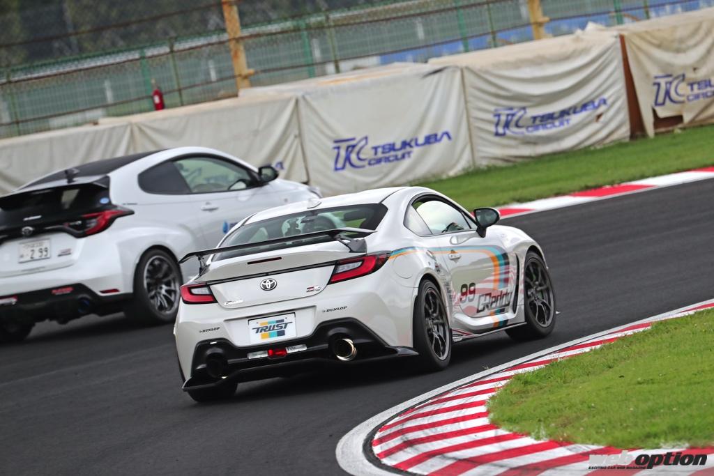 トラストのデモカーについては「1回目のテストとしてはポジティブな結果だと思います。新型GR86の懐の深さを残したまま、さらに旋回性が高まった仕上がりになっていますね。サスペンションは86後期用の製品がベースなのですが、減衰力の調整でかなり良いフィーリングを掴めました。フロントを若干硬くする方がバランスは良かったです。ただし、リヤサスのストロークは前モデル同様に不足しているので、今後リバウンドストロークを増やす方向性で煮詰めていきたいですね」。