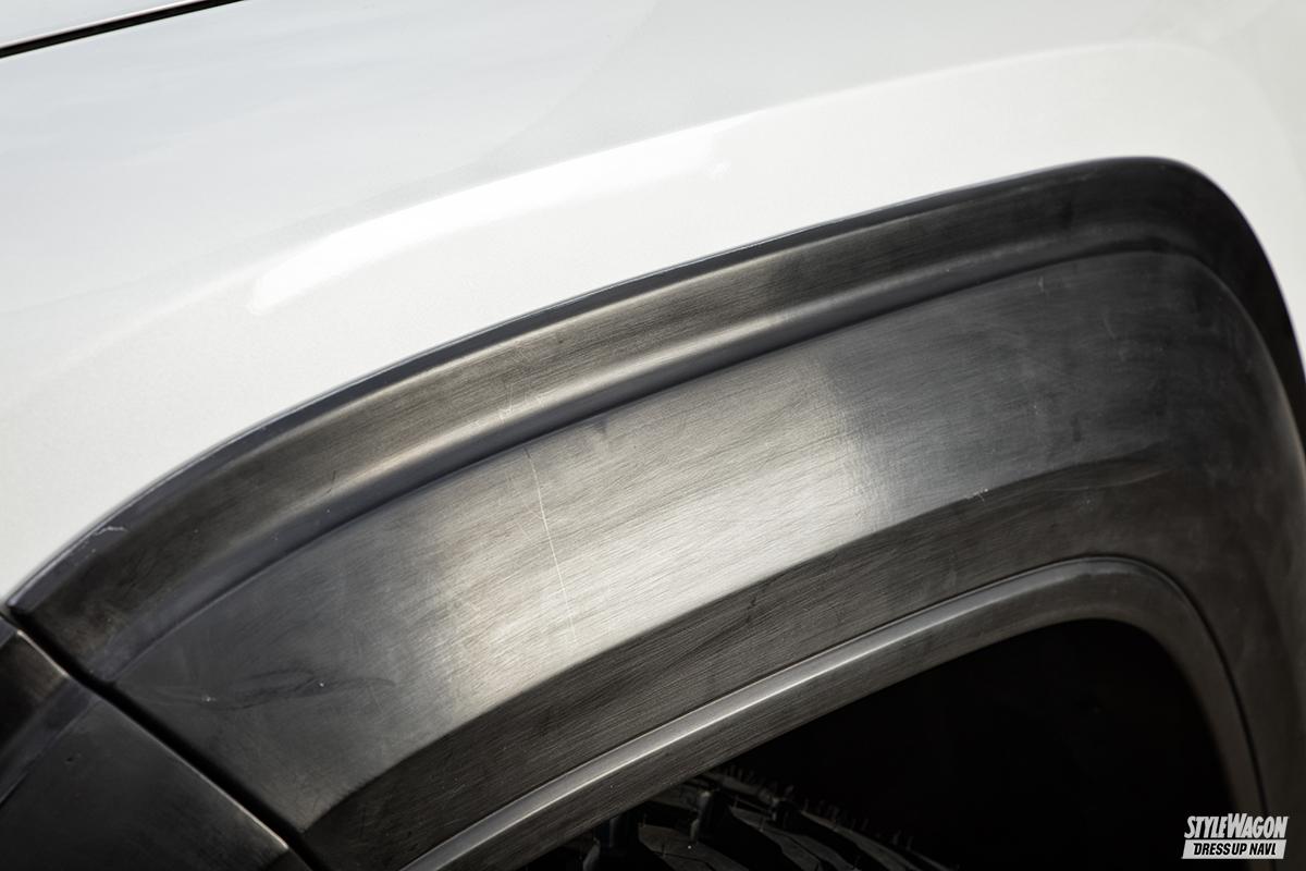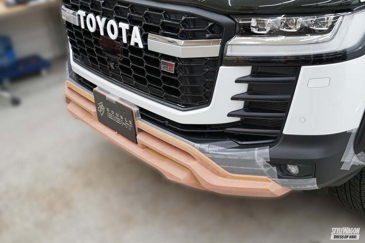 ダブルエイトではGRスポーツの純正バンパー車へのボディキットも開発作業が着々と進行中。その第一弾となるオーバーフェンダーは、先端部が純正バンパー下部のマットブラック部分まで延長され、オフローダーらしさの中にも滑らかな一体感を演出。その他、フロントアンダーに装着するハーフエアロやリアディフューザーについてもデザインがほぼ確定し、現在マスター型製作の真っ最中。この段階ですでに手元に車両が納車済み、という幸運なオーナー諸氏は、ダブルエイトの新作アイテムにぜひ、ご期待を!