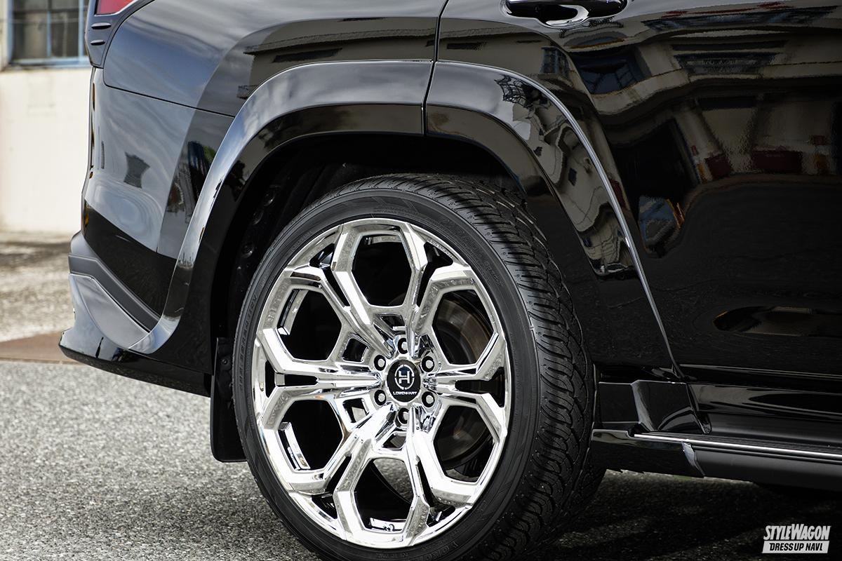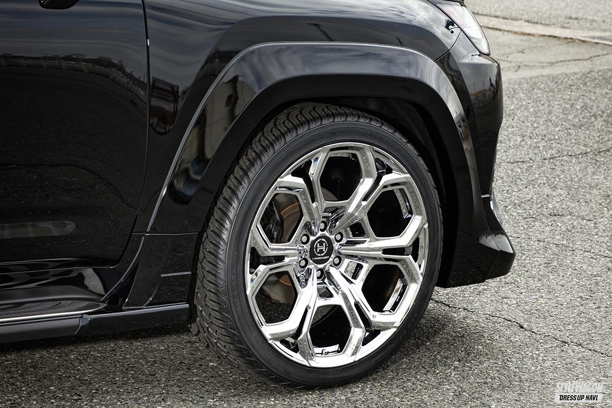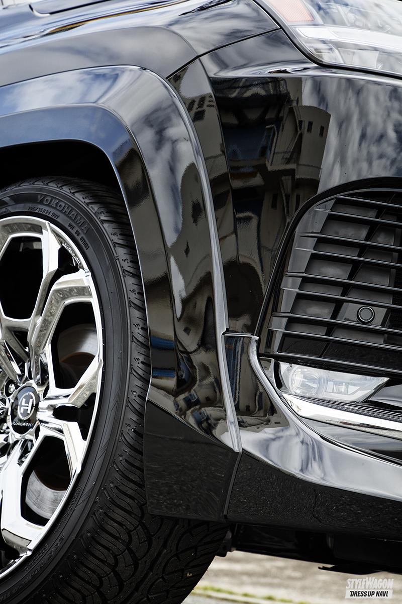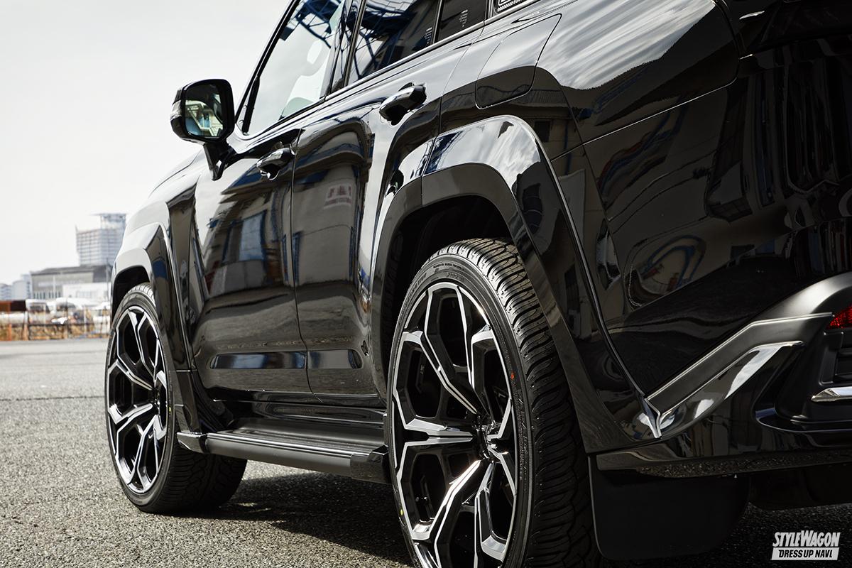 これまでランドクルーザー300に関してはモデリスタエアロ用のヒッチメンバーカバーや、ARBバンパー対応オーバーフェンダーなど、ニッチ層のニーズも幅広くカバーして来たダブルエイト。トレンドを一歩リードする独創的なセンスはレクサスLXに対しても存分に発揮されている。そのセンスの象徴とも言えるのが、2023年のオートサロンにおいて共豊コーポレーションと合同で展開していた同社ブースのセンターを飾った、LXのモデリスタエアロ装着車専用オーバーフェンダー。標準車用ではなく、あえてモデリスタエアロ装着車にターゲットを絞り込む思い切りの良さは、同社の真骨頂とも言えるもの。構成は前後のフェンダーパネルに加え、サイドステップへと続くラインの流れをより滑らかなものするエクステンションも採用。通常は9.0J+50前後のナロー&ハイインセットとなるが10.5Jというワイドリムホイールのインストールを可能とすると共に、SUVの最高峰としての品格にさらなる磨きがかけられている。