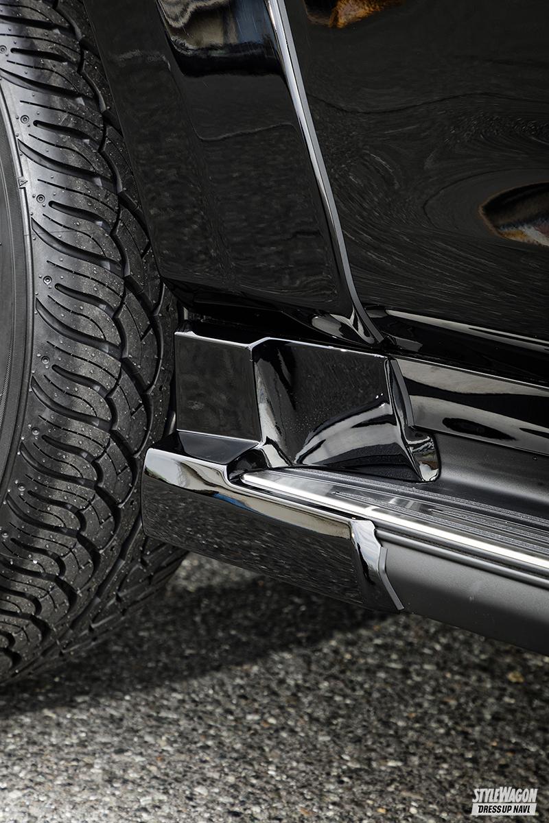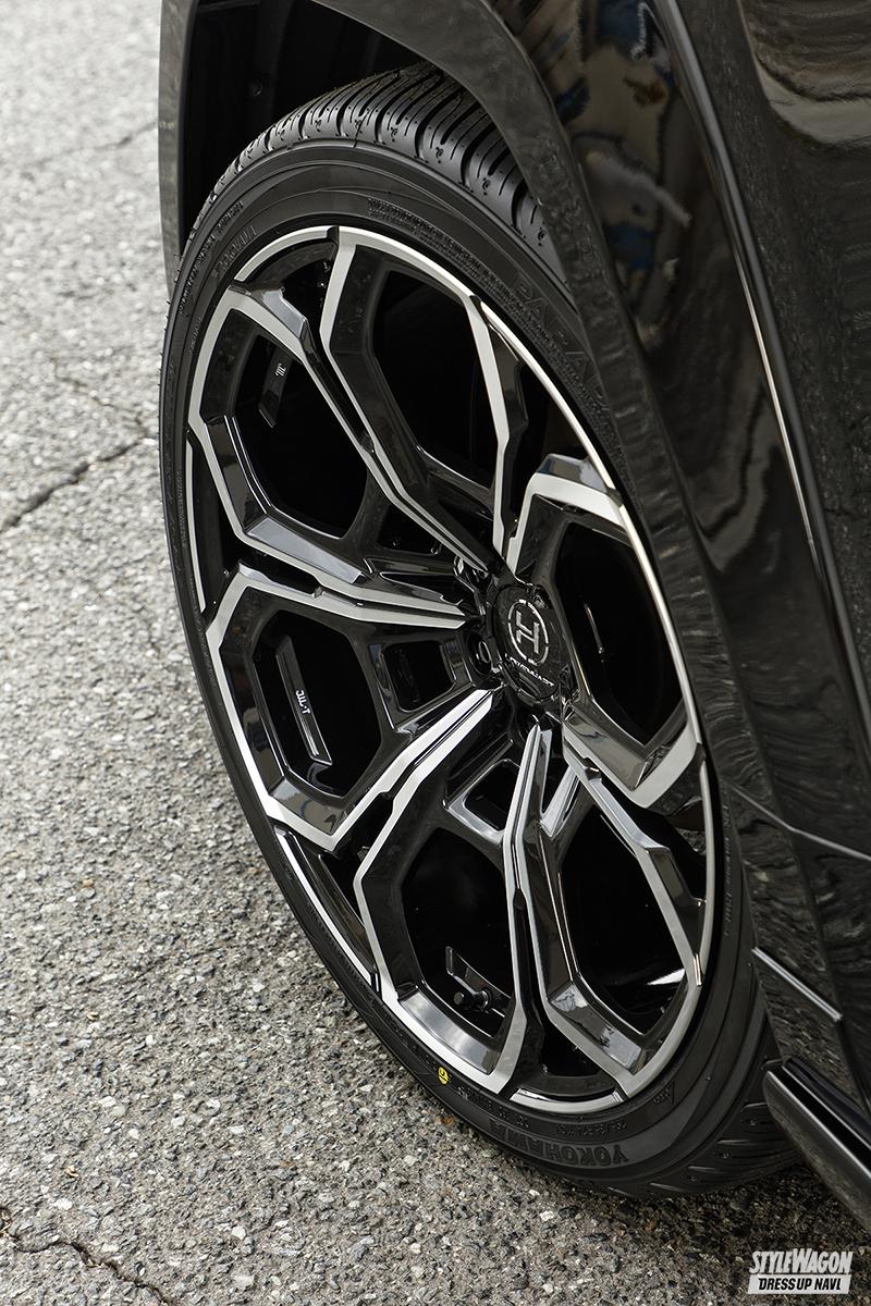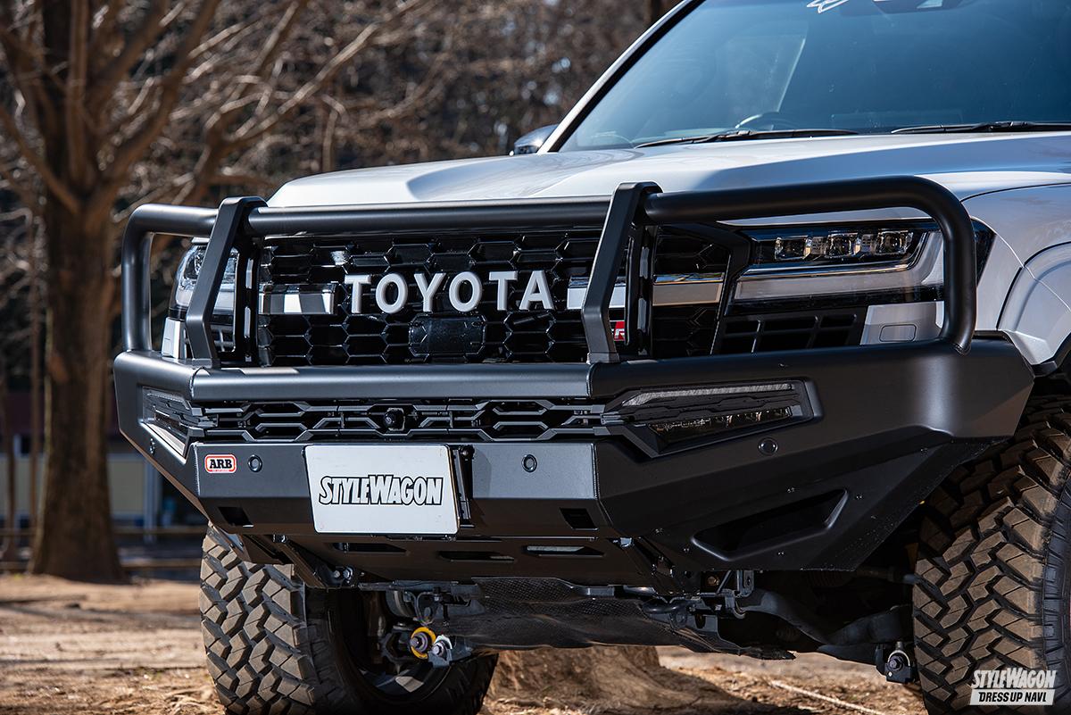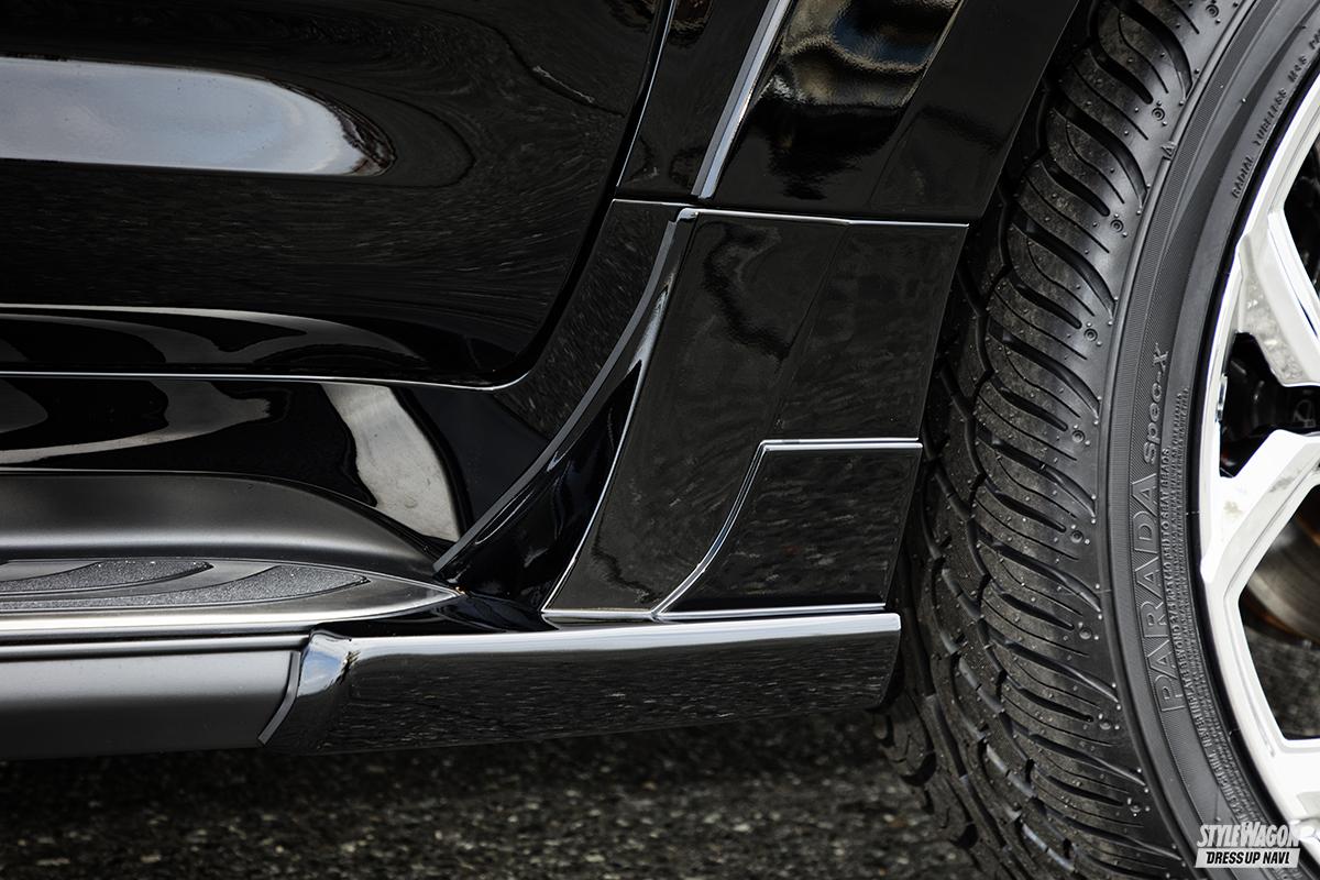 これまでランドクルーザー300に関してはモデリスタエアロ用のヒッチメンバーカバーや、ARBバンパー対応オーバーフェンダーなど、ニッチ層のニーズも幅広くカバーして来たダブルエイト。トレンドを一歩リードする独創的なセンスはレクサスLXに対しても存分に発揮されている。そのセンスの象徴とも言えるのが、2023年のオートサロンにおいて共豊コーポレーションと合同で展開していた同社ブースのセンターを飾った、LXのモデリスタエアロ装着車専用オーバーフェンダー。標準車用ではなく、あえてモデリスタエアロ装着車にターゲットを絞り込む思い切りの良さは、同社の真骨頂とも言えるもの。構成は前後のフェンダーパネルに加え、サイドステップへと続くラインの流れをより滑らかなものするエクステンションも採用。通常は9.0J+50前後のナロー&ハイインセットとなるが10.5Jというワイドリムホイールのインストールを可能とすると共に、SUVの最高峰としての品格にさらなる磨きがかけられている。