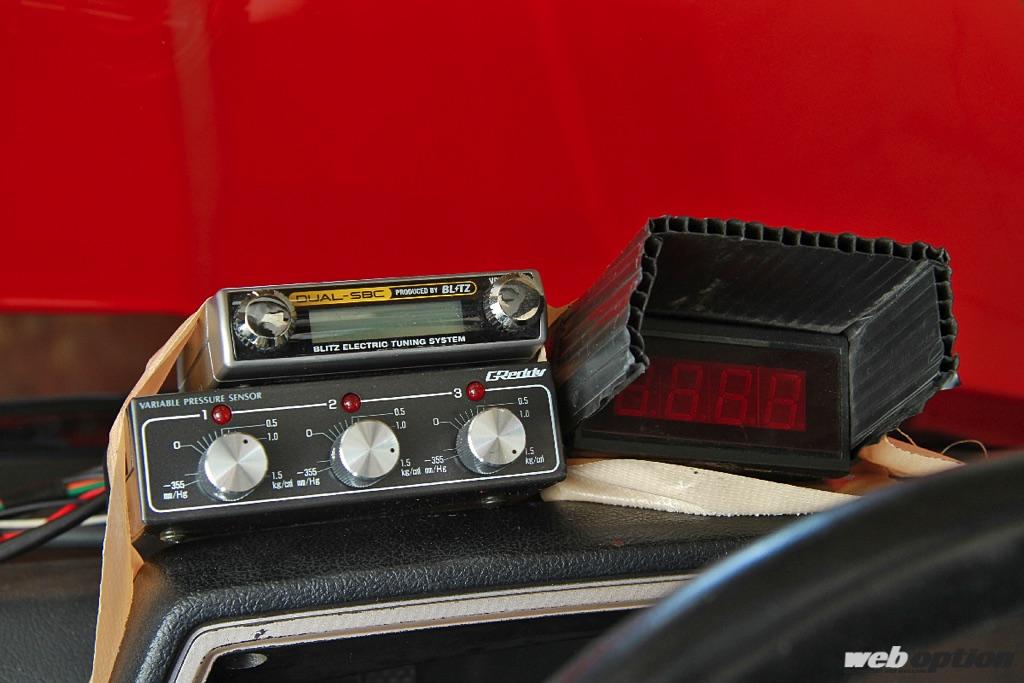 エンジン制御はF-CON Vプロ単体で行われる。スピードメーターはVプロに車速信号を入れるためのもので、メーターとしては機能していない。また、最大ブースト圧2.0キロ以上でも確実な点火を実現する最強トランジスタキットも確認できる。
