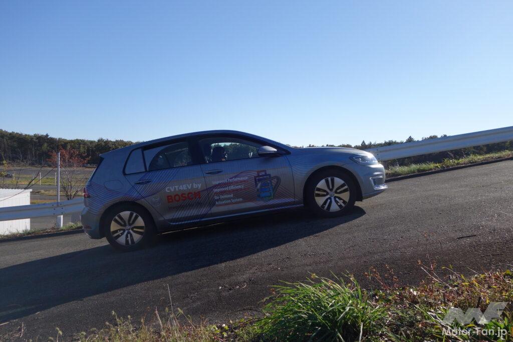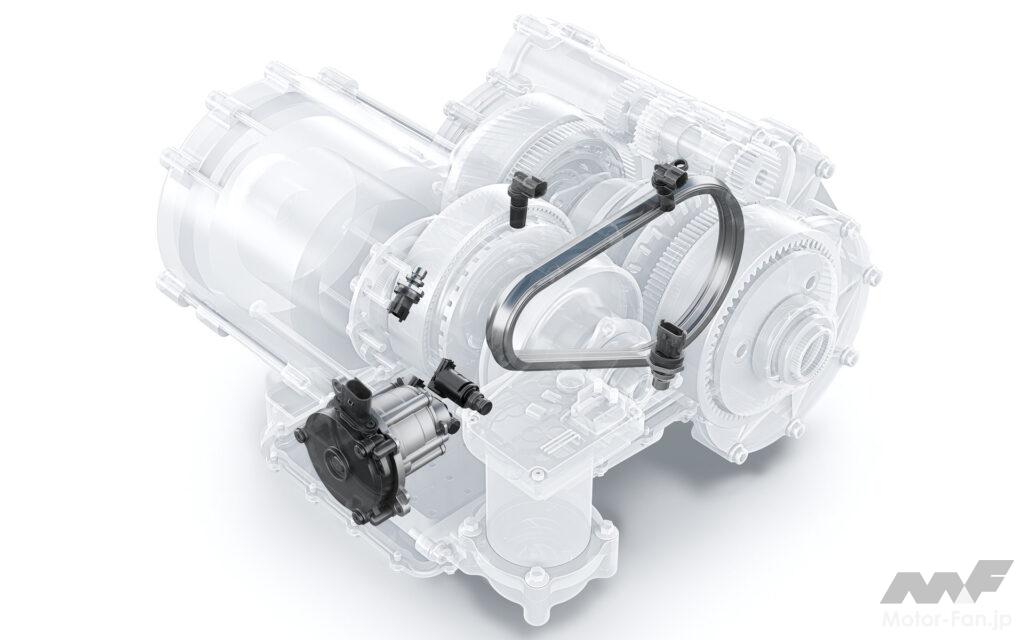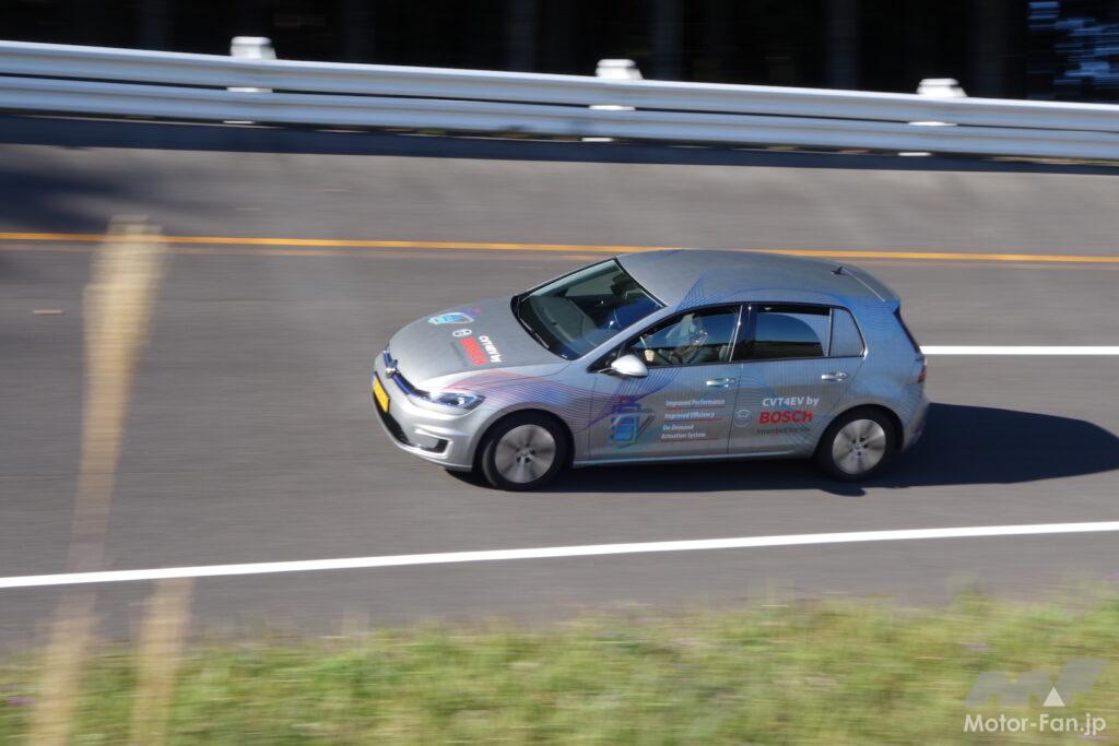 モーターは回転し始めから最大トルクを出す出力特性とする製品が多く、自動車用駆動装置としては理想型のひとつとされている。そのいっぽうで高回転側では効率が落ち、特に超高速域走行を求められる欧州では有段変速機を組み合わせる市販車も現れている。ボッシュの目論見は、無段変速比を得られるCVTによって、高効率運転領域をピンポイントで狙い続けるとともに、速度レンジを大幅に広げることだ。