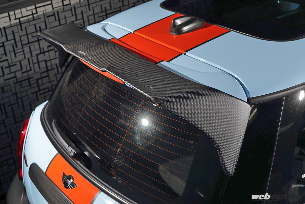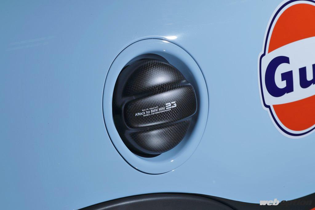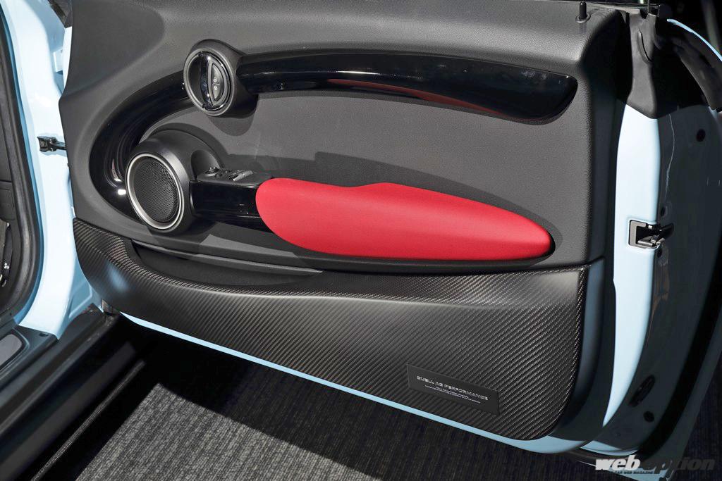 一方の室内では、MINI MAX社との共同開発で誕生した独創的なメーターゲージが存在感を主張する。ステアリングコラム上には、メーターフードをセットしてデフィのブースト計と温度計を配置。さらに、ドア内張りの一部をカーボン化するなど、エクステリアに見合ったスポーティかつハイクオリティなインテリアを構築している。
