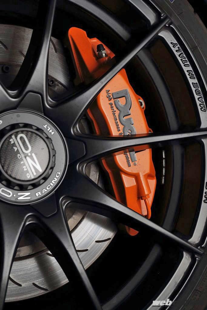 当然、リヤセクションの作り込みにも抜かりなく、高精度のカーボンリヤスポイラー&ディフューザーをセット。存在感のあるリヤバンパーの中央から顔を覗かせる可変バルブ付きのデュアルテールマフラーも、デュエルAGのオリジナルだ。