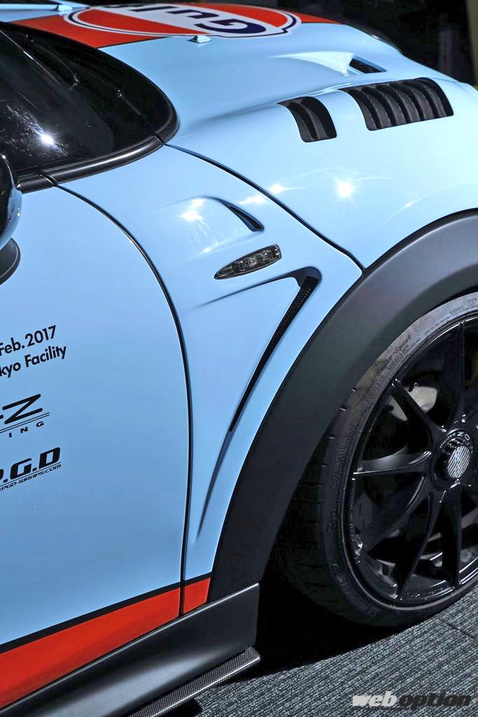 カタログスペックでも231psを発揮するこのホットハッチをベースに、デュエルAGらしい遊び心を注入。水色にオールペンして、伝統のガルフカラー(もちろんメーカー公認!)に仕立て上げたスタイルが特徴的だ。