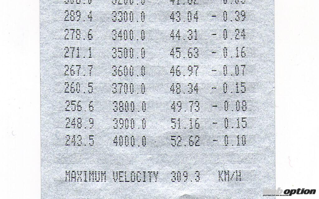 結果は衝撃的だった。テスト車両は250km/hを超えても怒濤の推進力を炸裂し続け、そのまま大台を突破。最終的に6速6800rpm近くまで回し切り、小野ビット計測で309.3km/hをマークしてみせたのだ。