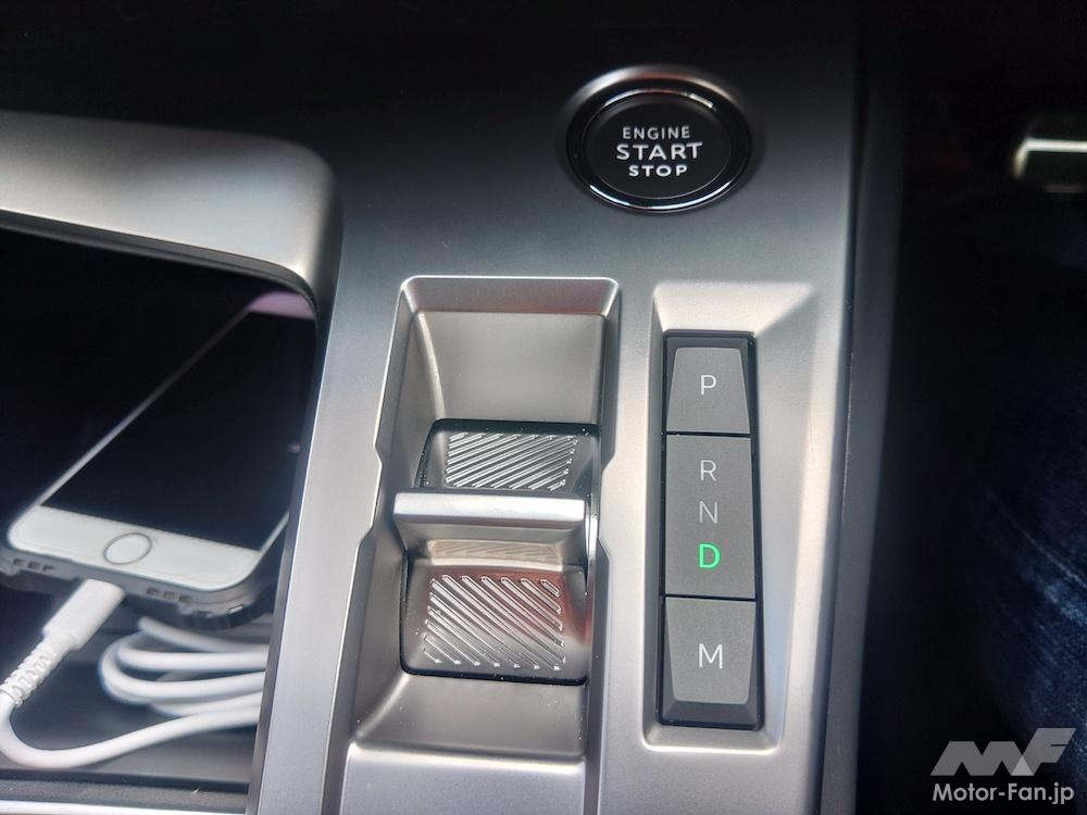とはいえ基本的にセレクターの操作は停止時なので、慣れなくても視認して操作すれば良かった。それはパーキングブレーキのスイッチも同様。ただ、[M]モードへの切り替え(シフト操作自体は[D]でもパドルシフトで行えるが、[M]でないとギアはホールドしない)や、ドライブモードの変更を運転しながらブラインドで操作しようと思うと慣れが必要かもしれない。慣れないうちは停止時に操作した方が安全だと感じた。