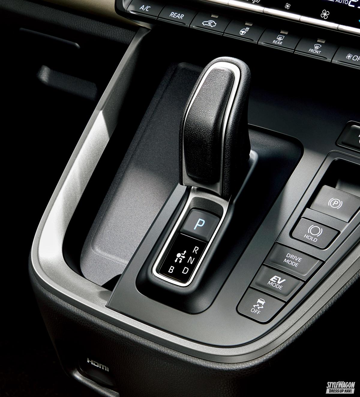 ダッシュボード上辺を抑え、ピラー内側をブラックアウト化することで、見え方も含めて開放感あふれる空間に仕立てた。ヴォクシーは、ブラック内装のみで精悍さも漂わせている。両サイドのエアコン吹き出し口まわりやセンタークラスター、ステアリングなどにシルバー塗装などを施している。上質感のあるソフトパッドも配するなど、トヨタらしい質感の高さを享受できる。特徴的なのは、シフトレバー左側のリッド付トレーで、スマホなどをスマートに収納できる反面、リッドの脱着が煩わしく感じられることもある。