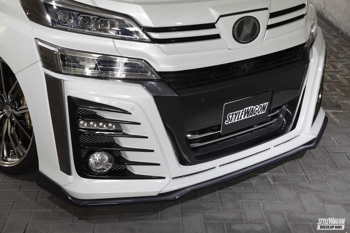 高級Lクラスミニバンのヴェルファイア用としては4種類を揃える。大胆かつ上質感あふれる造形美でブランドのフラッグシップを飾るシンプルハーフな“リチェルカート”、スポーティな雰囲気に磨きをかけたハーフタイプの“デポルテ”、純正ボディラインをリスペクトしつつさりげなくも存在感のある造形美に仕立て上げたフラップエアロの“LSC”、そしてここに紹介する“Belta(ベルタ)”というのがそのラインアップの全貌だ。