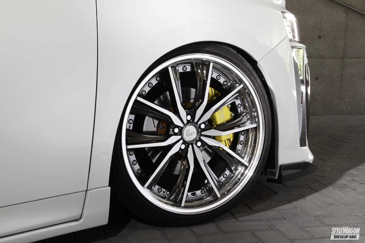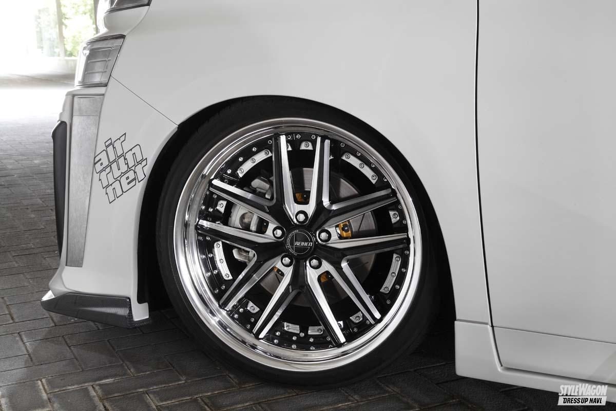 プロショップのサンヤードがオリジナルテイストを注入した今作。特徴的なのが純正メッキのギラギラ感を抑制したメッキデリートの顔面。本来ならメッキのフェイス上半分がボディ同色仕様へとカラー変更されている。ホイールはレオンハルトのアングリフ(21×9.5+10)を履き、足回りはACCエアランナー。Jラインの10mmロングのフロントロアアームに、リアにはスイングアーム、アッパーアームなどのアンロックシステムを導入。ブレーキはフロント330φ、リア340φのBiotブレーキオフセットキット、さらにメタルの質感と独特のカラーが楽しめるサンヤードのオリジナルのブレーキキャリパーもプラス。キャリパーカラーはクローム、キャンディ、フレーク、マジョーラなど色で遊べる仕様(写真はイエローフレーク)。こちらは福井・鯖江の漆器職人が特別に塗り上げた逸品なのだ。
