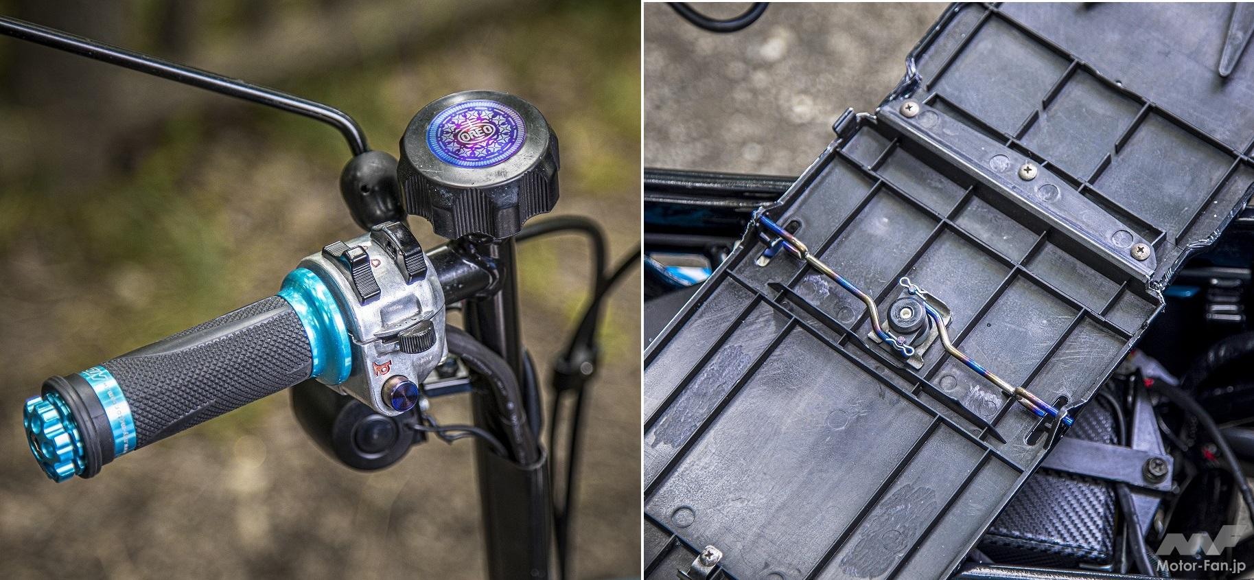 また燃料(バッテリー)は本来燃料タンクが収まる中央部を利用し、リチウムイオンバッテリー/ポリマー電池(最大20A)を搭載。普段使いでは十分な航続距離となっている。