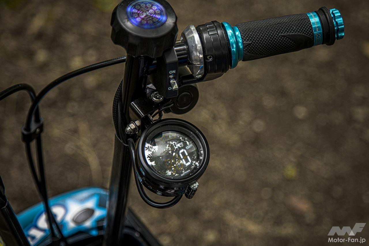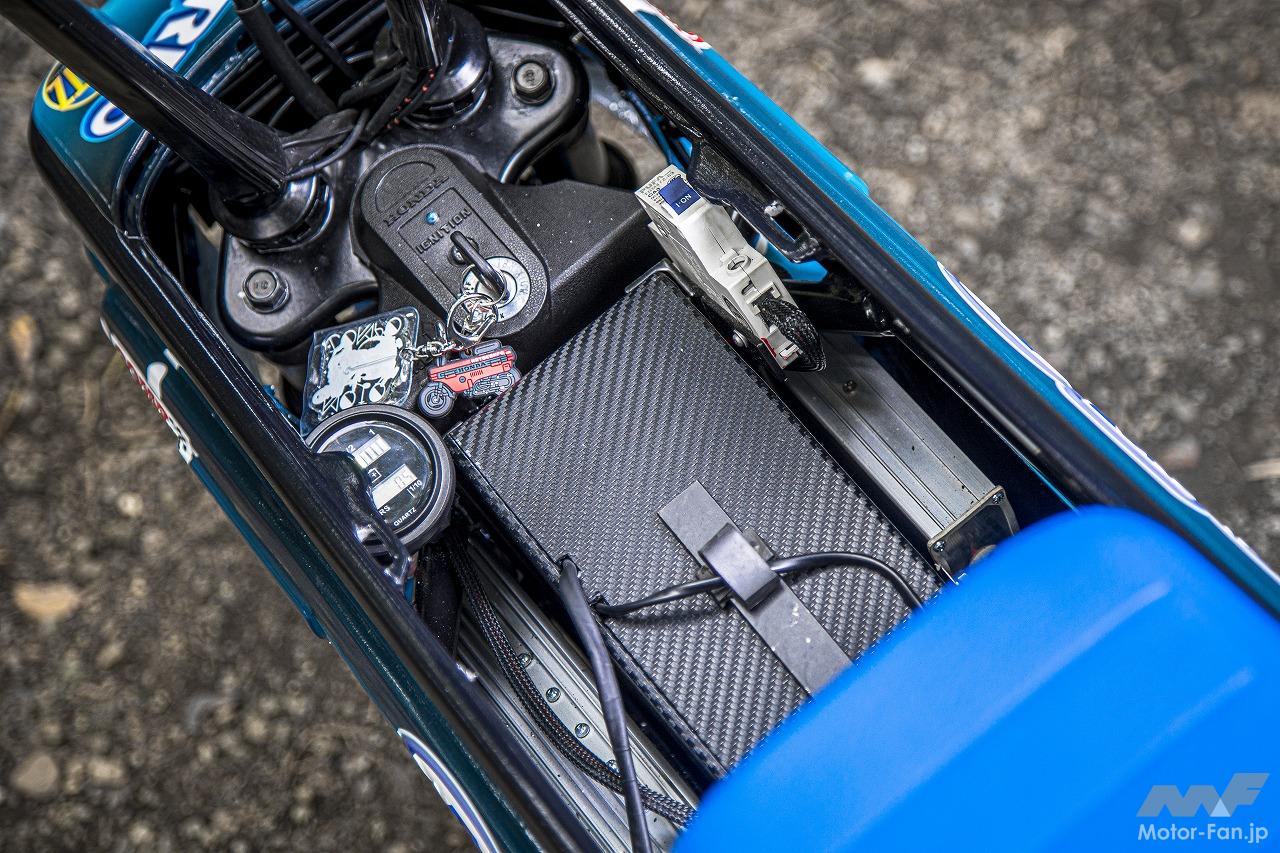 四角形のレトロな純正メーターから、ハイテクなデイトナ製デジタルメーター(ヴェローナ)に入れ替えつつ、ノブキャップをチタンにして高級感を獲得。なおフタ用ロックロットやステップペグのピンなどもチタンにして細かな個所もアップデートされている。