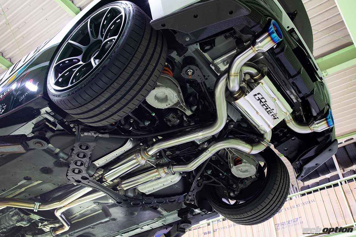 SUS304材を使い、接合部にTig溶接が施されるパワーエクストリームRは、絞りなしのストレート構造を採用しながら、保安基準にも適合したマフラーだ。排気系のレイアウトは基本的に先代Z34と変わらないが、搭載するエンジンが異なることから当然、各部の見直しや最適化も図られている。例えば、加速騒音規制をクリアするためにサブサイレンサーを追加したり、音質を追求して左右メインパイプが交わるポイントを変更したりなど、だ。