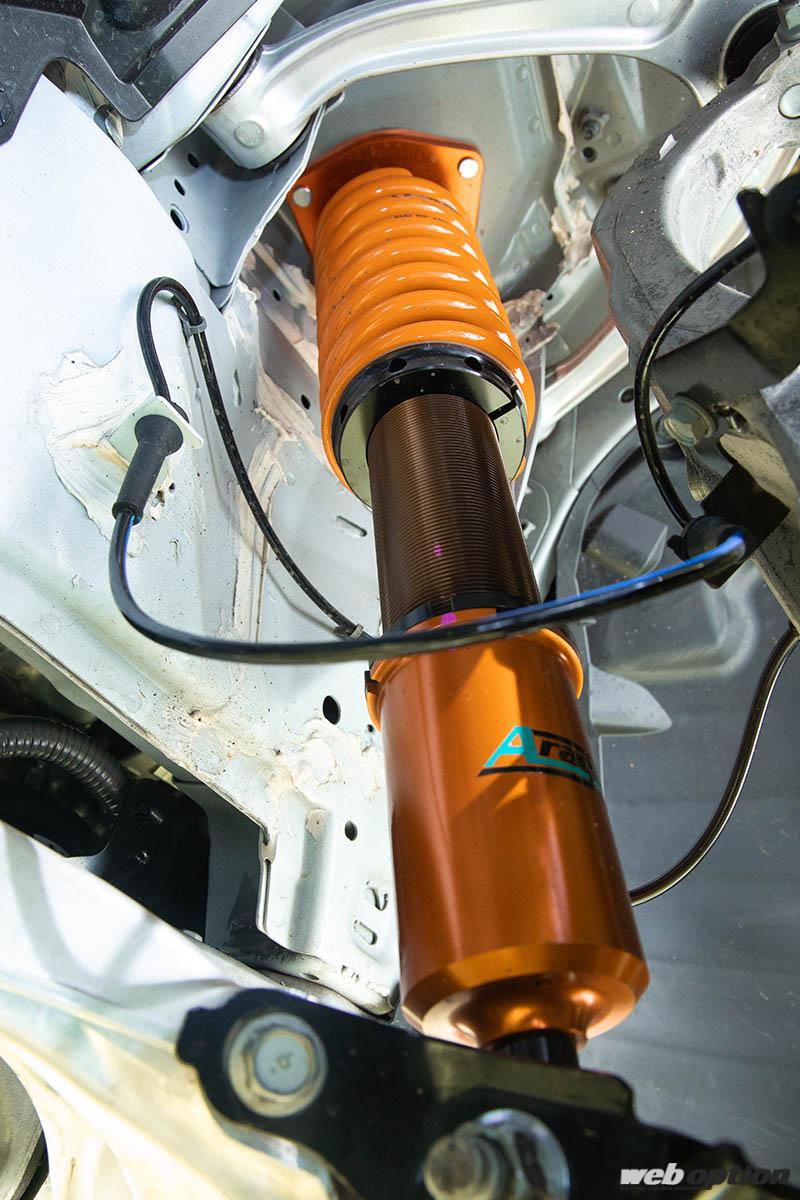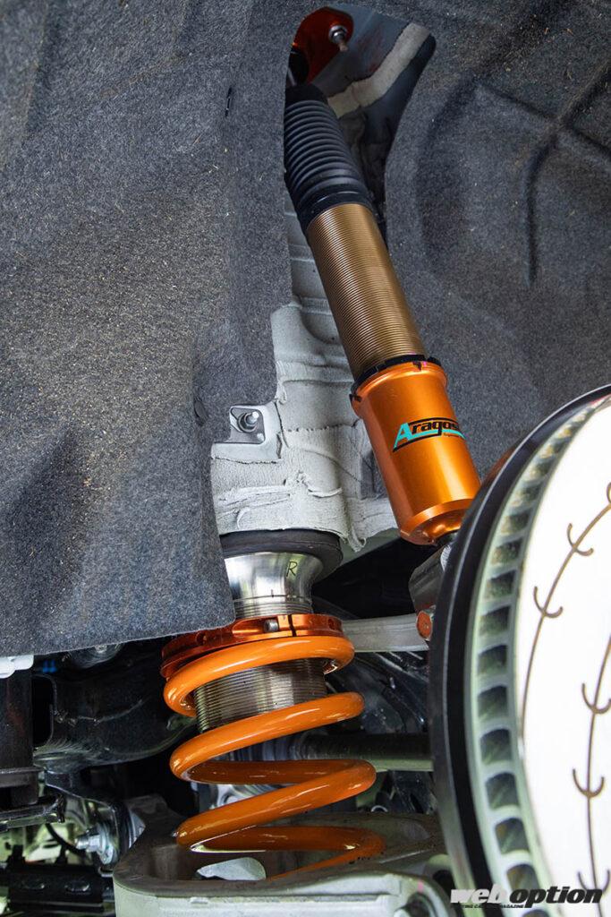 足回りは、2022年8月に高速周回路での最高速アタックを行なったままの仕様だ。車高調のベースは、アラゴスタタイプSで前後18kg/mmのスプリングを組み、ストリート向き標準モデルに対して伸び/縮み側ともに減衰力が高められている。
