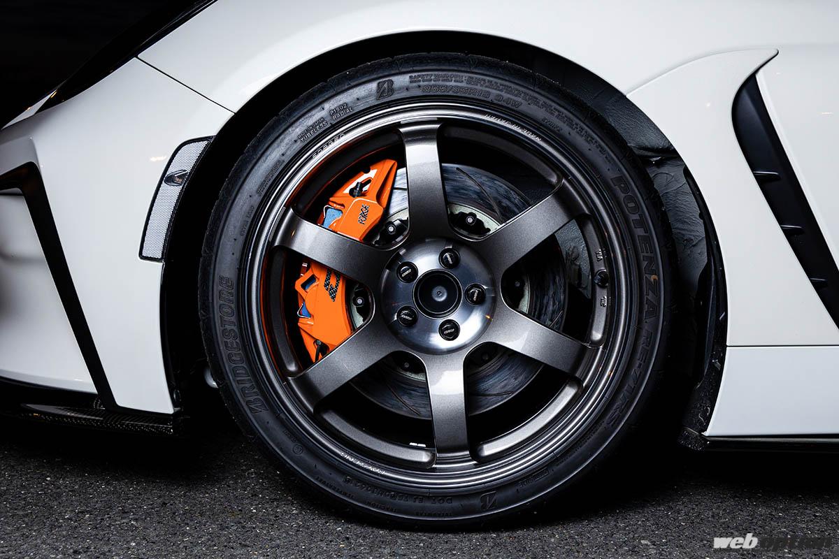 ホイールはボルクレーシングTE37SAGA SL(9.0J×18+52)で、タイヤにはポテンザRE-71RS(255/35-18)を組み合わせる。サスペンションはD2ジャパン製で、今回の最高速アタックに合わせてフロントのスプリングを16kg/mmから12kg/mmへとレートダウン。キャンバー角も直進安定性を重視てサーキット走行時よりも起こしたそうだ。