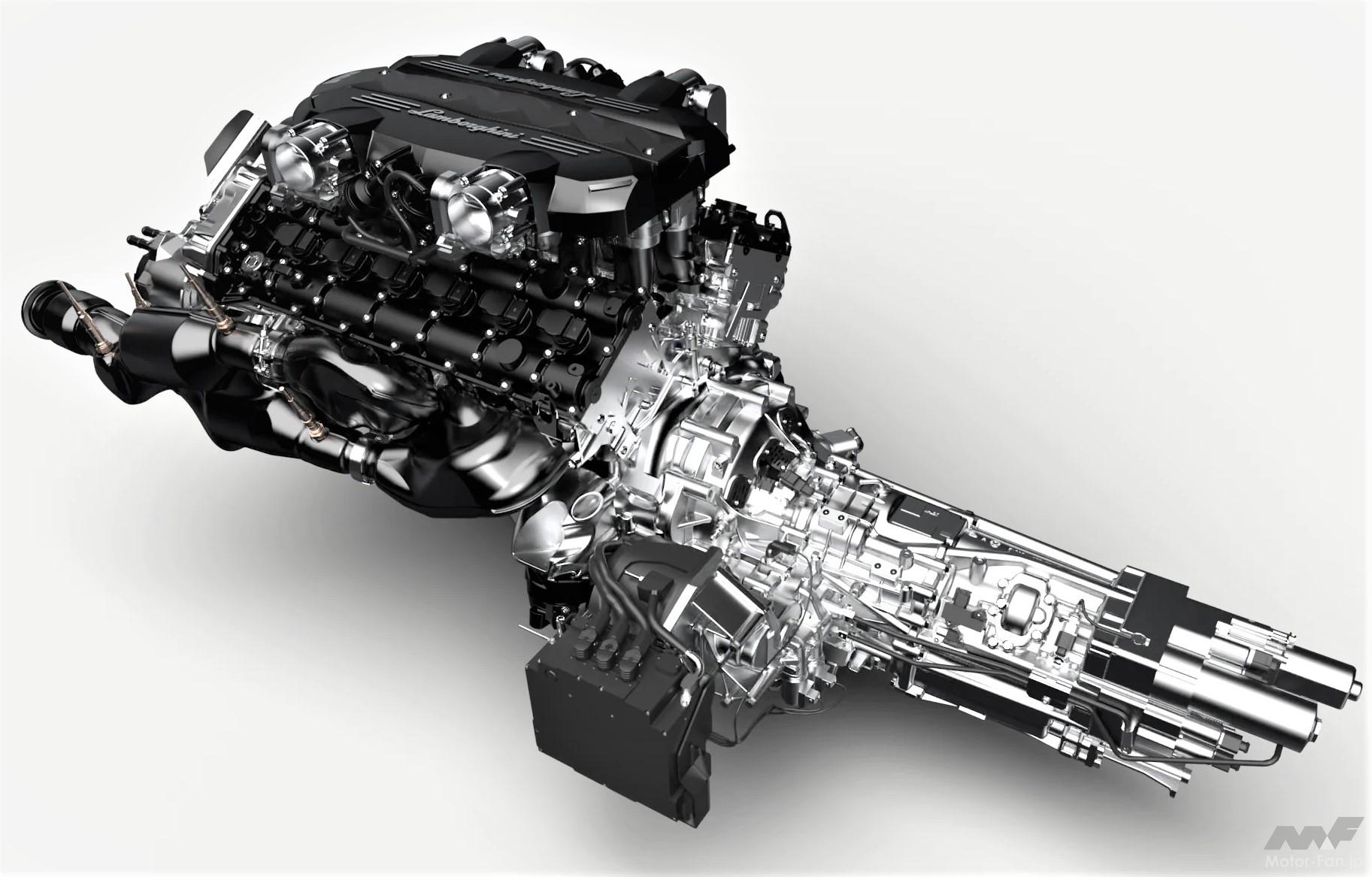カウンタック LPI800-4は前後をマルチチューブラーフレーム、キャビン部分をモノコック構造としたカーボンファイバー製セミモノコックを採用。サスペンションはプッシュロッド式、パワートレインに組み合わされるトランスミッションは7速の自動変速式マニュアルトランスミッションで、“元祖”カウンタック、ディアブロ、ムルシエラゴなどと同様に、車両前方にトランスミッションを置き、プロペラシャフトを介して車両後方に備わるデフにトルクを流す特殊な搭載方法がとられている点までは、ベースとしたアヴェンタドールと同様です。しかし、パワートレインがハイブリッドである点が異なっています。
