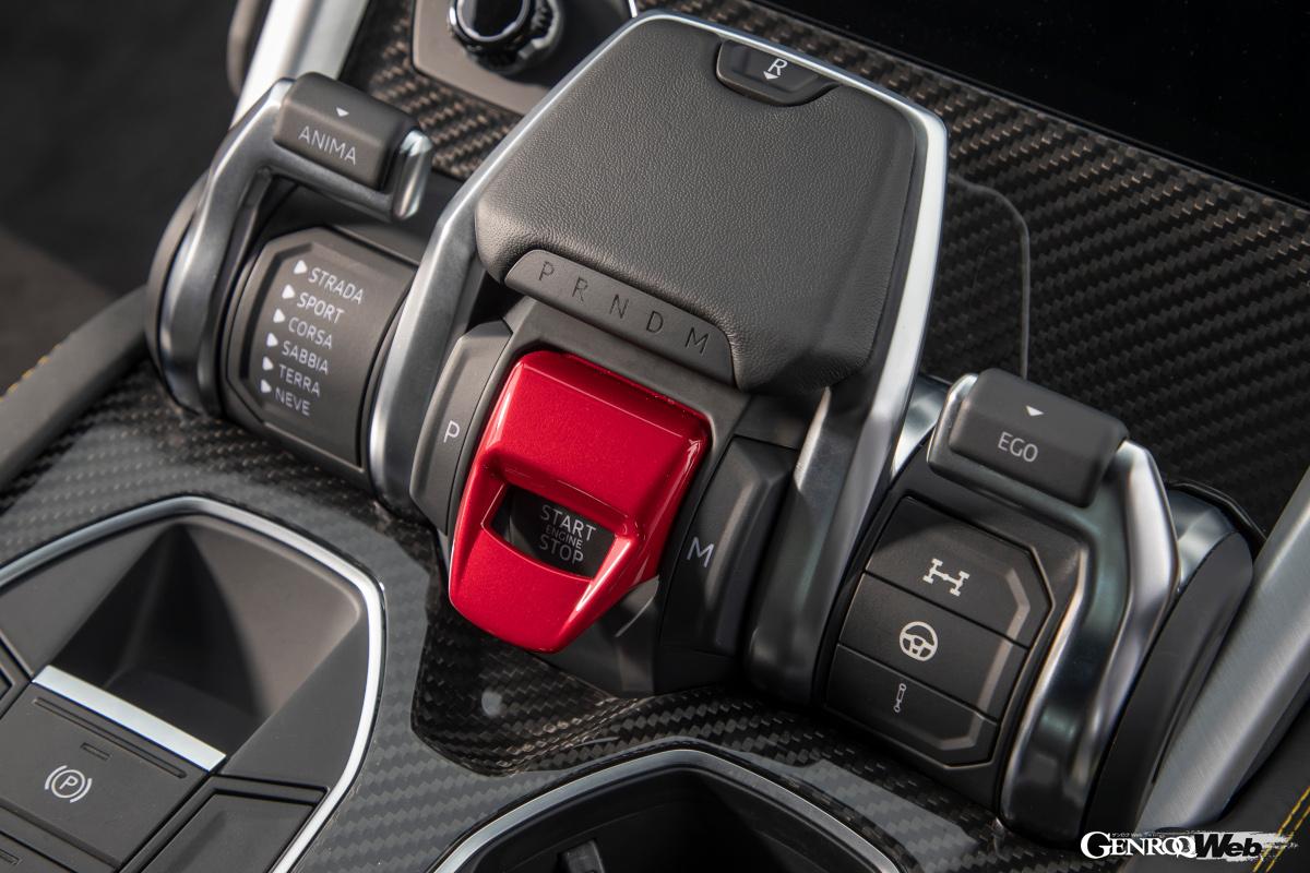 そのエクステリアと同様に、インテリアもまた前衛的なデザインで、かつラグジュアリーの極みといった印象だ。操作系の中で最も特徴的なのは、「Tamburo=タンブーロ」と呼ばれる走行モードの切り替えスイッチである。