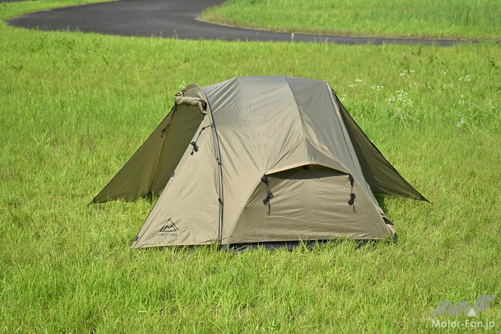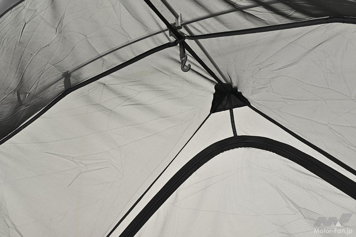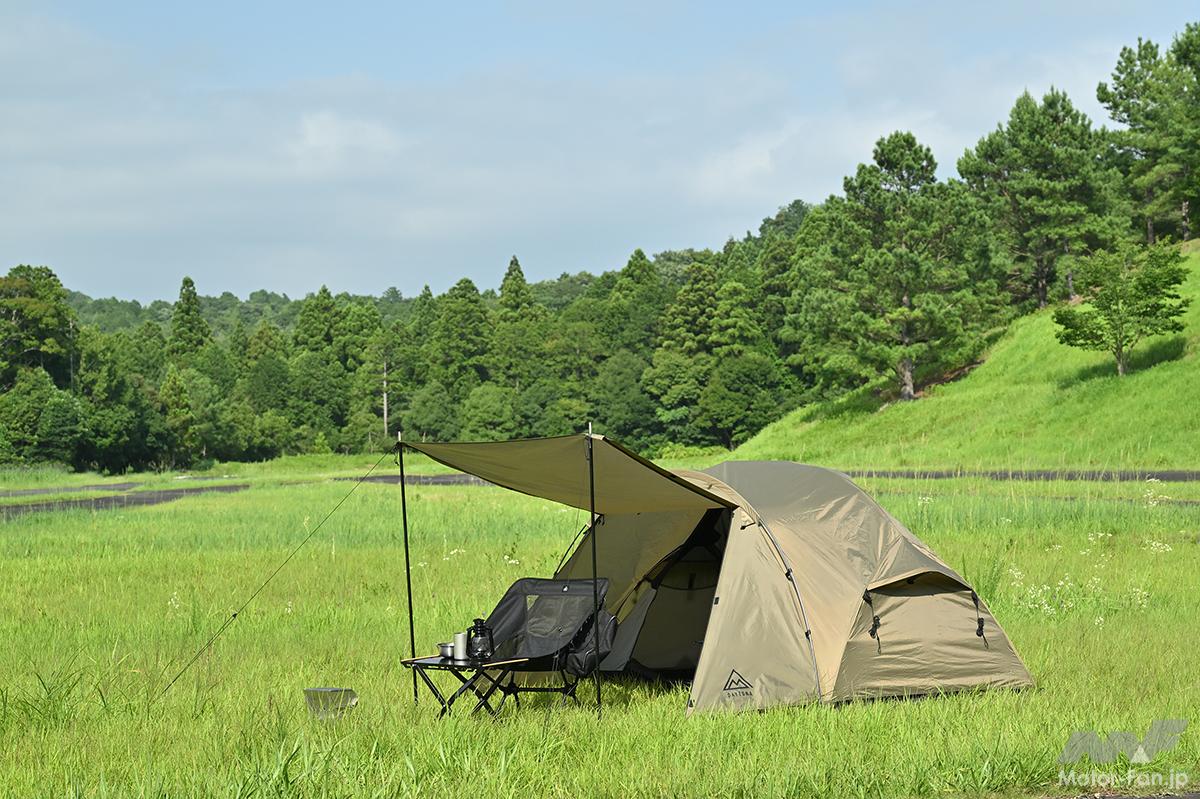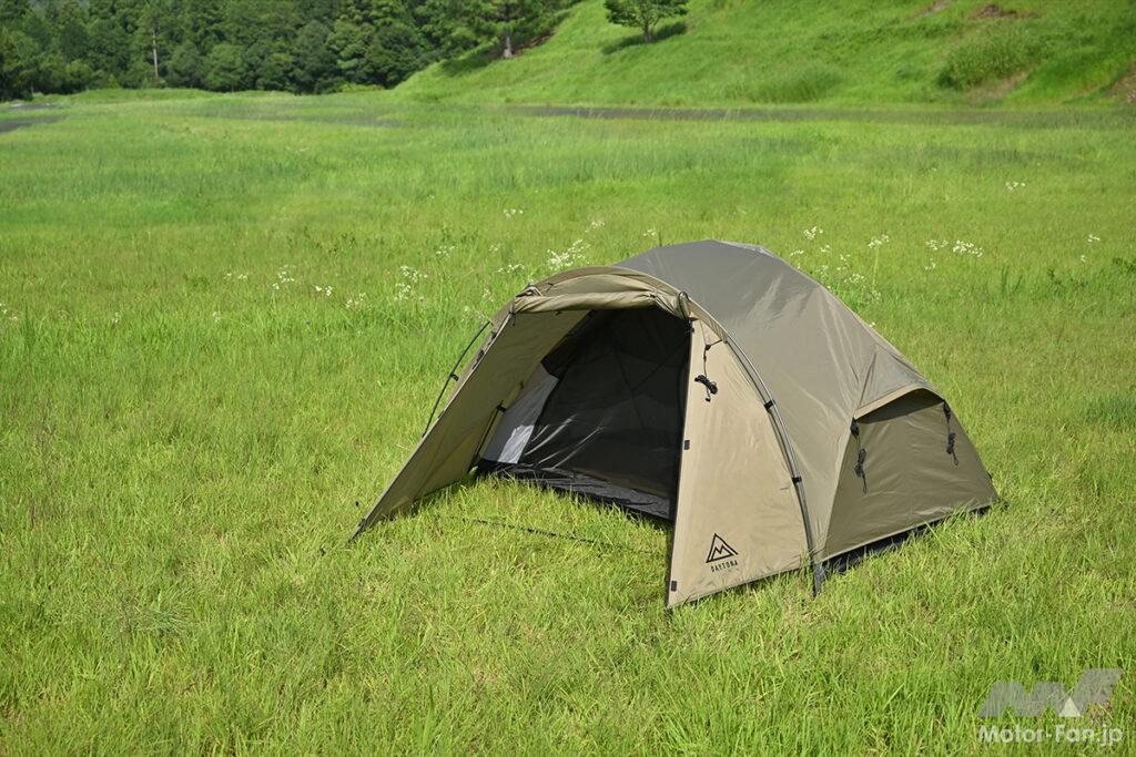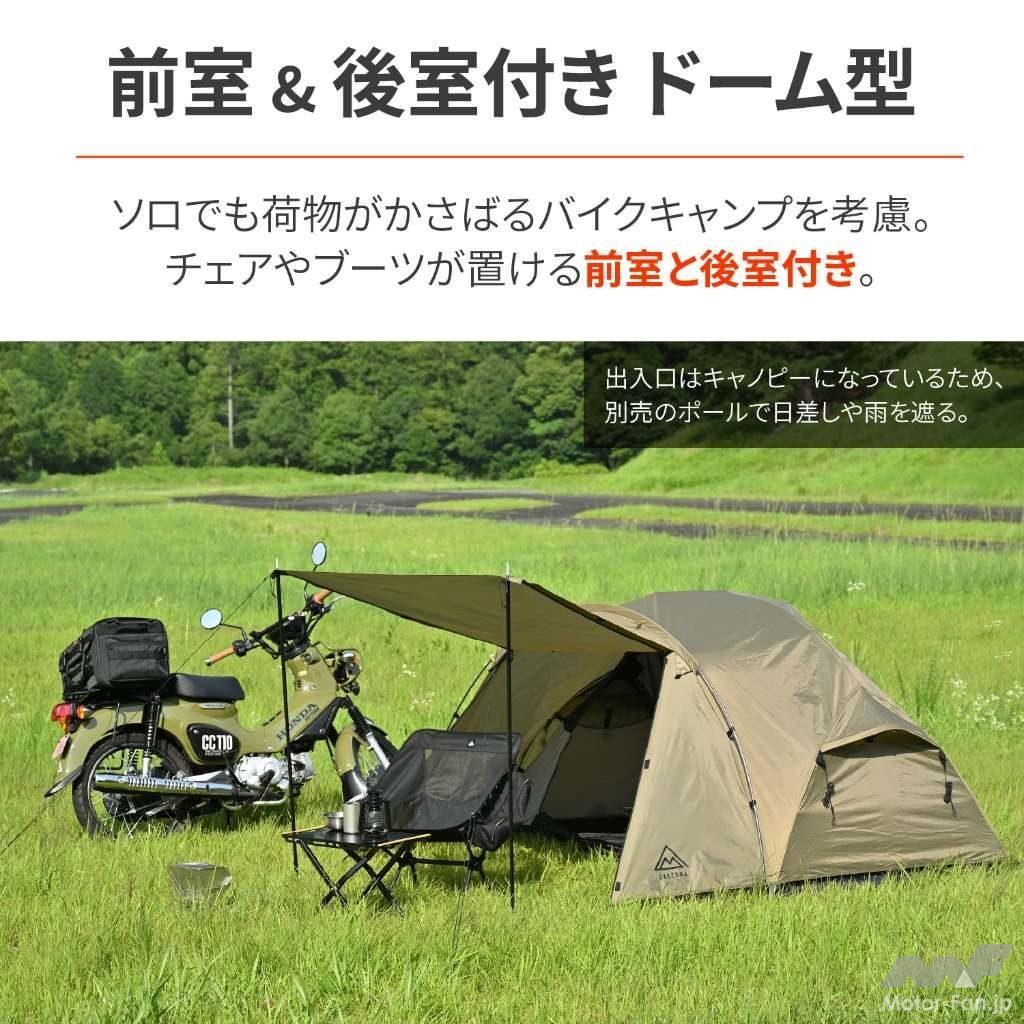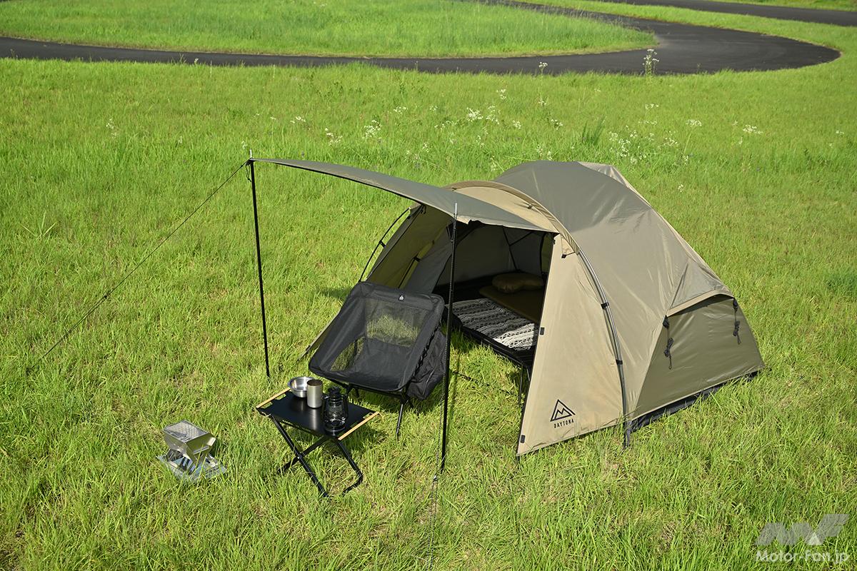 荷物が多くなりがちなバイクキャンプを考え、室内はバイク装備を置いても快適に寝られる広さを獲得。1人用テントとしては広めの前室に設計するなど、荷物をしまっておける十分な広さを獲得している。