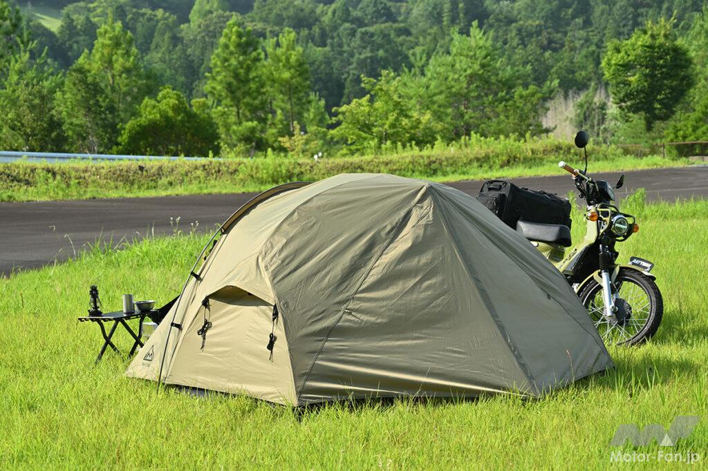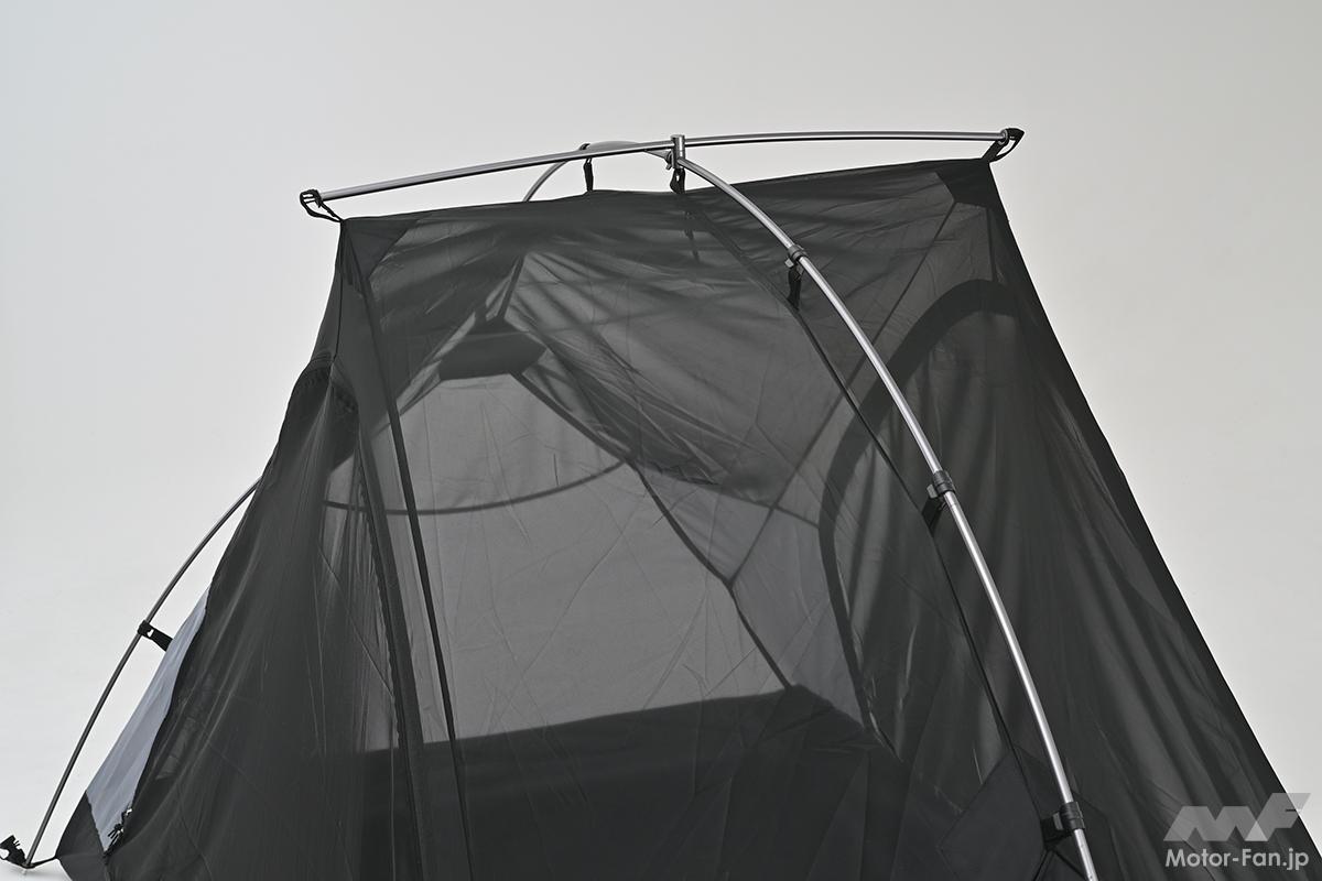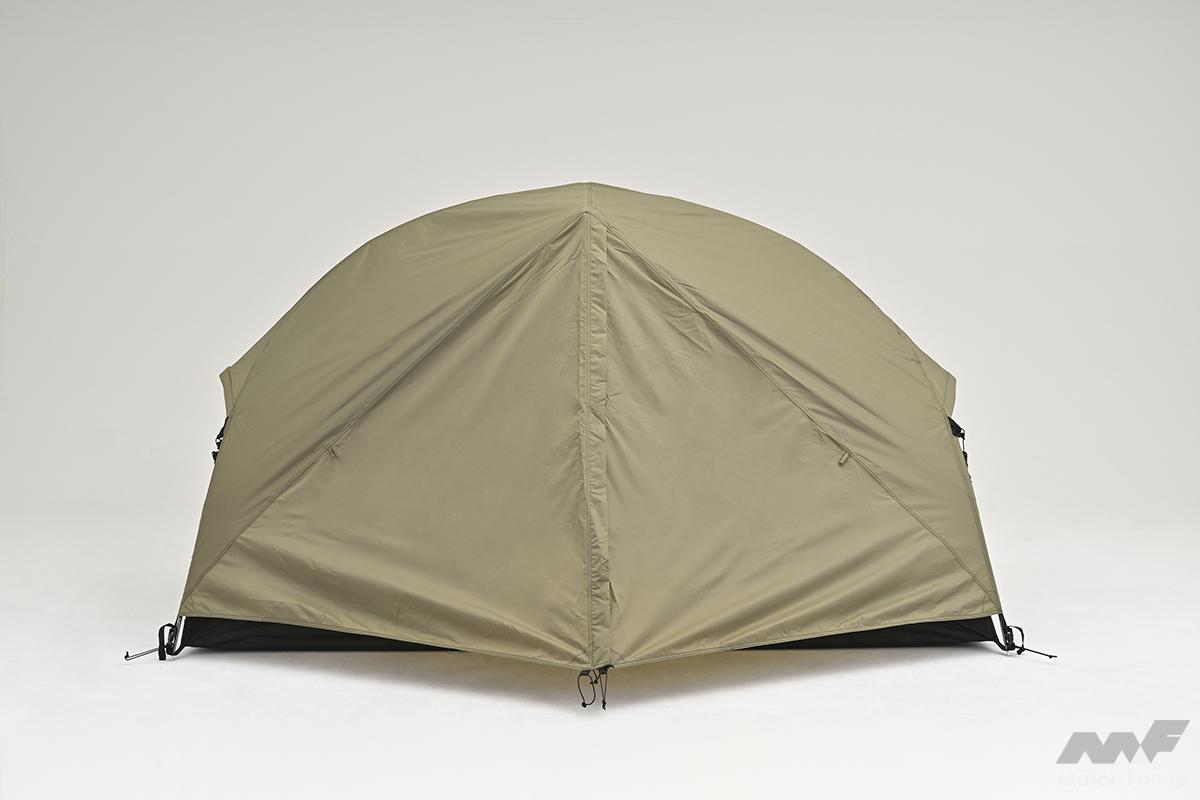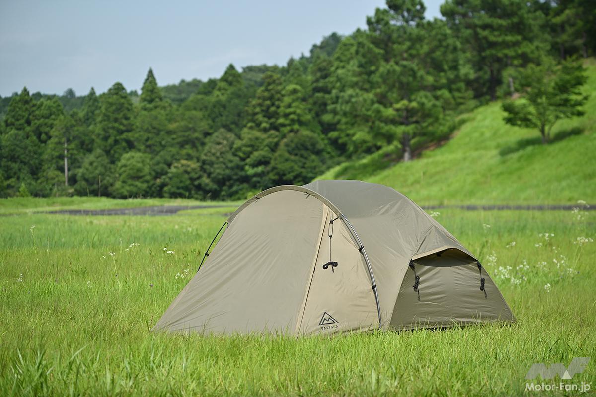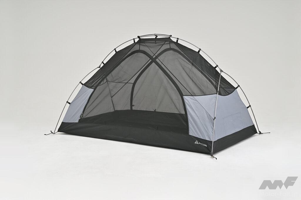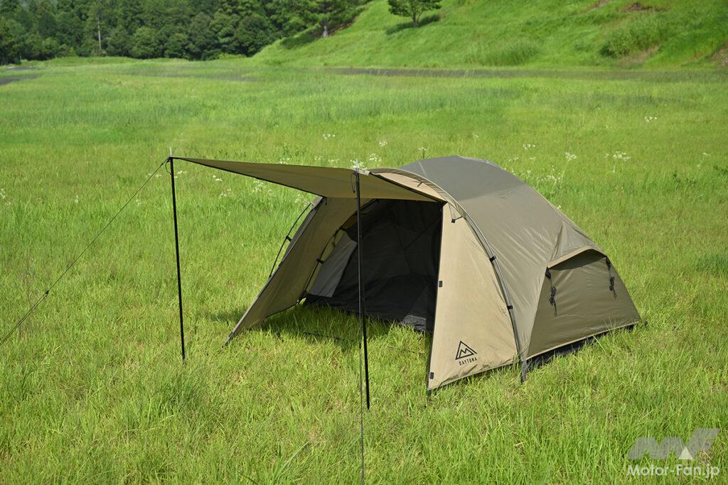 荷物が多くなりがちなバイクキャンプを考え、室内はバイク装備を置いても快適に寝られる広さを獲得。1人用テントとしては広めの前室に設計するなど、荷物をしまっておける十分な広さを獲得している。