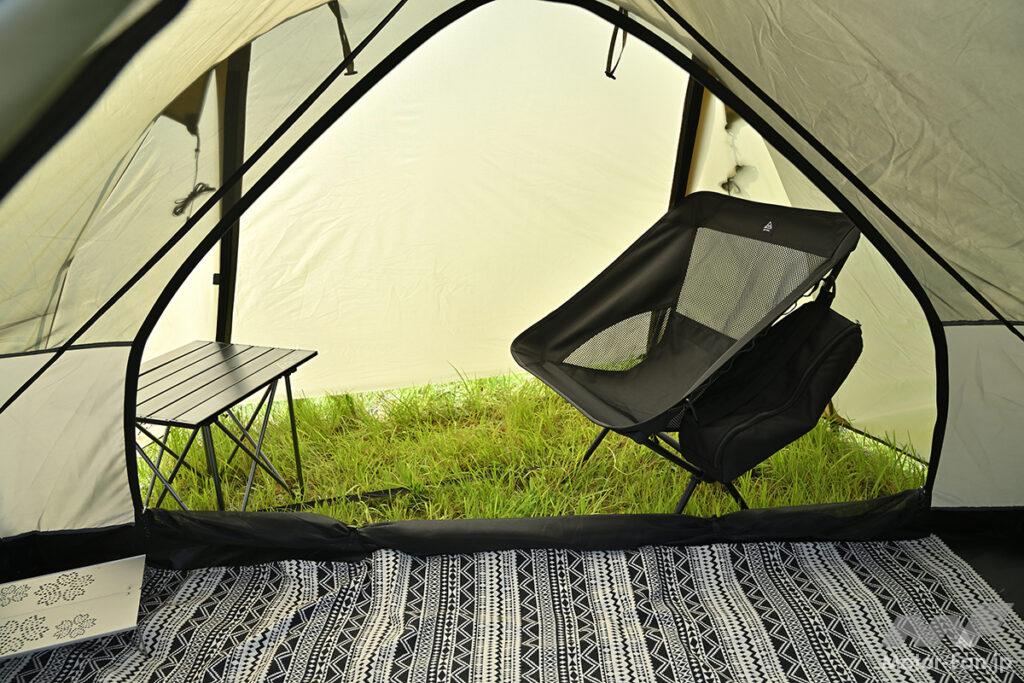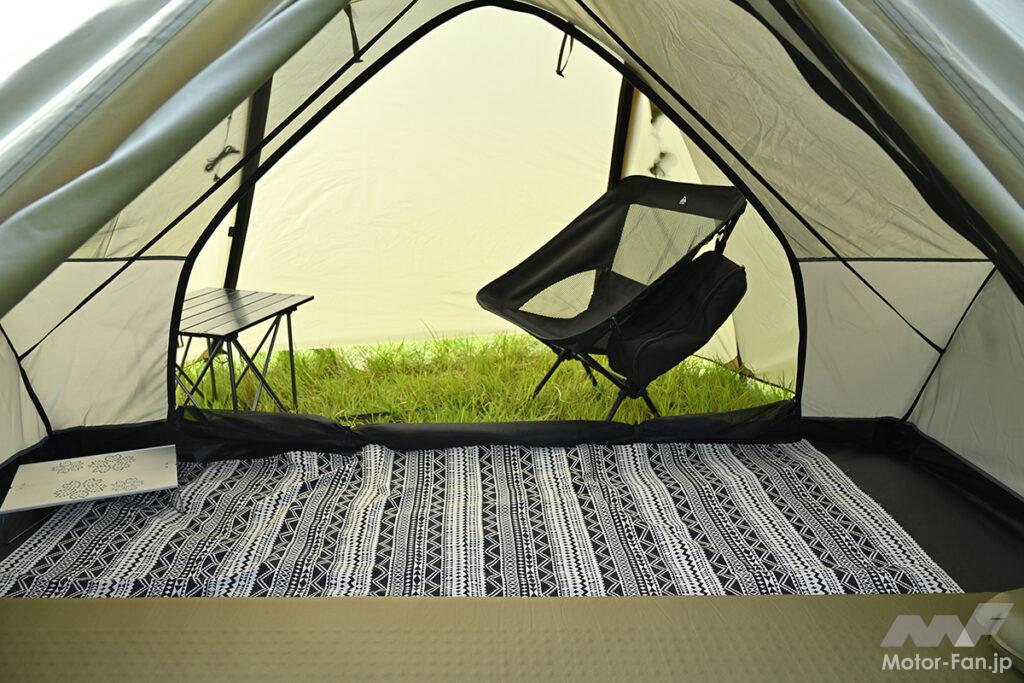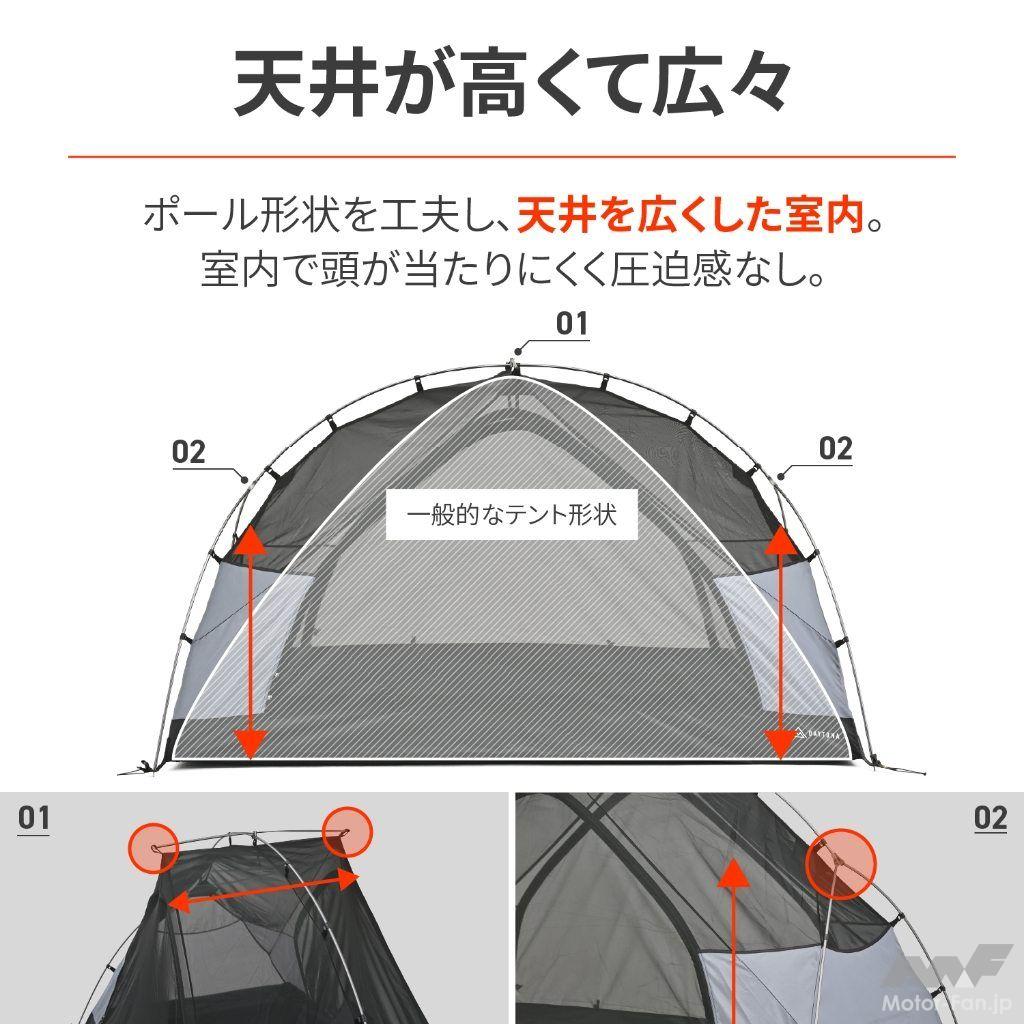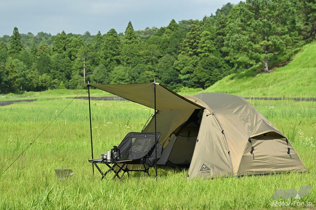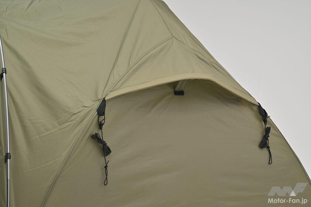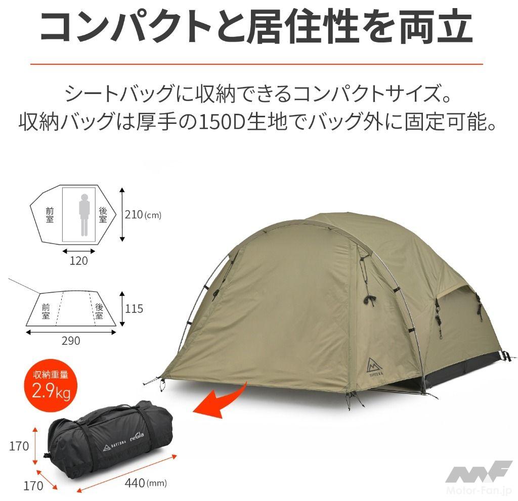 荷物が多くなりがちなバイクキャンプを考え、室内はバイク装備を置いても快適に寝られる広さを獲得。1人用テントとしては広めの前室に設計するなど、荷物をしまっておける十分な広さを獲得している。