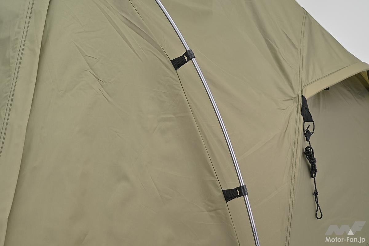 急な雨にも対応するため、外幕のフライシートは耐水圧3000mmを発揮する、68デニールのポリエステル生地を採用。フレームとなるポールには山岳系テントにも使用される、強度が高くて軽量なアルミ合金(A7001)を導入。
