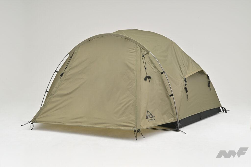 デイトナから新発売の『neGla(ネグラ) ハーフドーム』は、初心者でも1人で簡単に設営可能。しかもイスやテーブルなどの荷物を置くのに便利な、前室と後室を設けたドーム型テント。地面から垂直にポールを立ち上げることで、天井が高く、しかも広々とした室内空間を確保している。