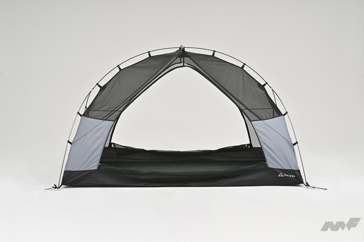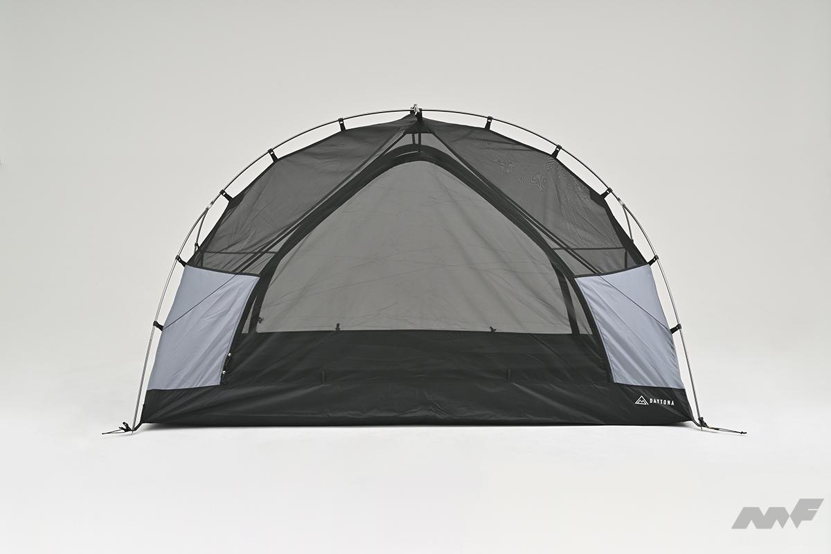 ・前室と後室があり、アウトドアグッズとライディング装備の両方がテント内に収まる