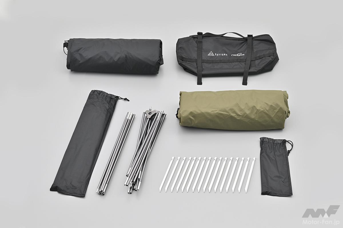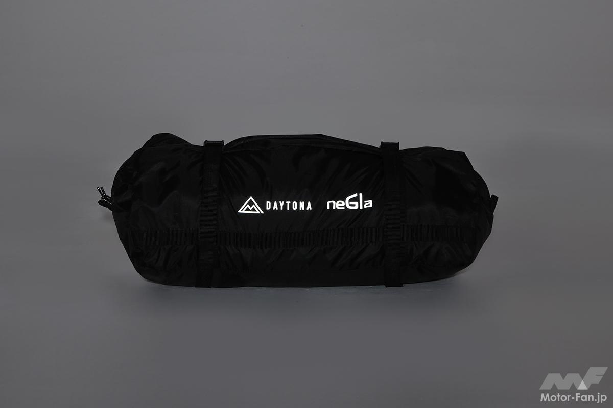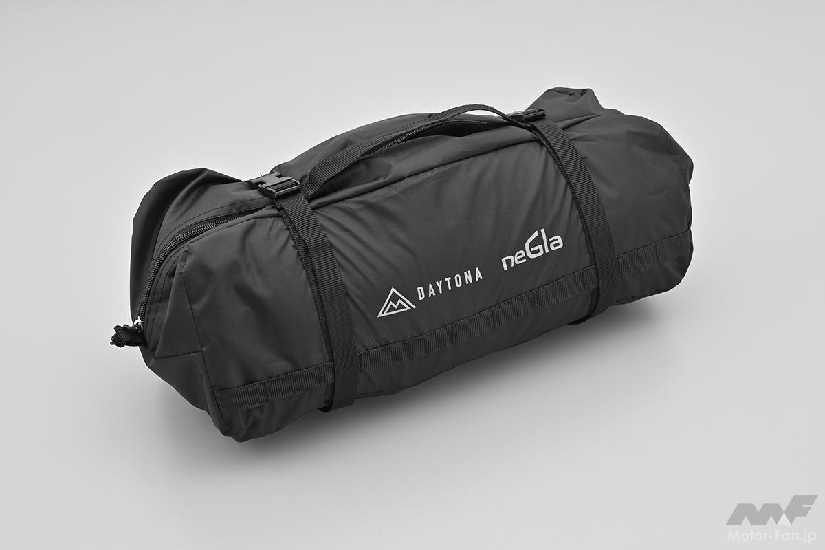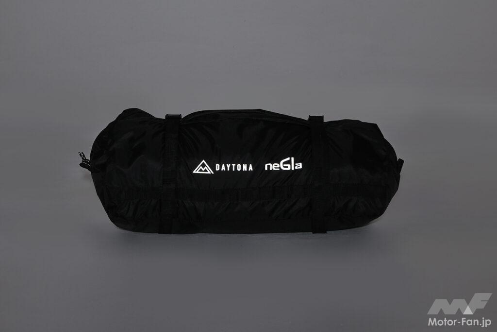 室内には収納ポケット、ランタン掛けフックを装備。収納時は幅440mmに収まるため、GIVIサイドケースTREKKERシリーズに収納可能。収納袋は出し入れしやすいように開口部を広く設計し、テント撤収時も簡単に収納OK。