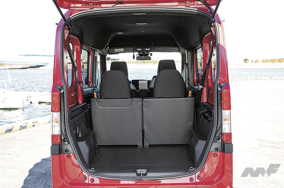 そんなレイアウトを採用したゆえに、データとしての荷室長はパワーパックを床下に置くレイアウトの競合車にはおよばないが、ホンダ独自の〝センタータンクレイアウト〞を採用した低床パッケージングをより生かすべく、運転席以外にはすべてダイブダウン式で格納時には低くフラットになる設計を採用。さらに、助手席側のセンターピラーを省略したボディ構造も全車に取り入れて、駐車時の歩道側にも大開口部を用意する工夫も独自の売り物としている。