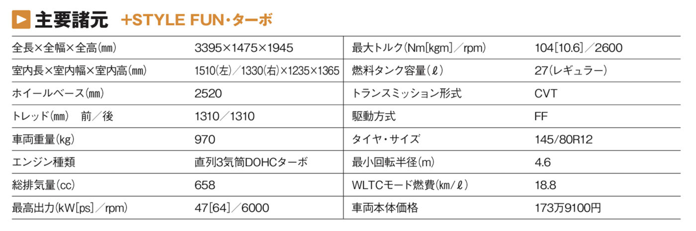 全高は N-BOX より155mm高く(FF車の場合)、より縦長なフォルムとなっている。撮影車である「+STYLE FUN」系は専用フロントバンパーやツートーンホイールキャップを装備。最小回転半径はグレードにより4.6mから4.7m。