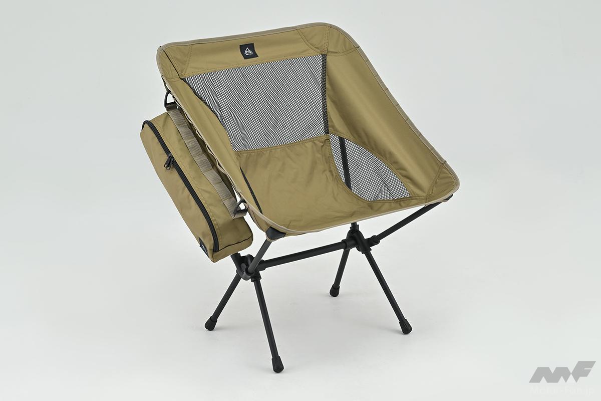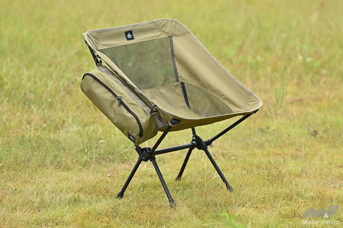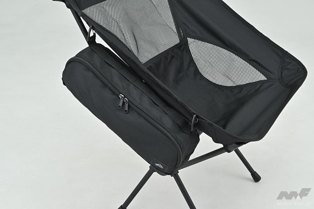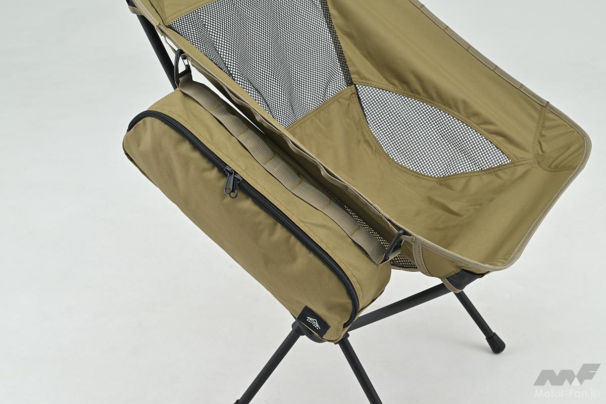 写真は軽量コンパクトながら、快適な座り心地を確保したコンパクトアウトドアチェア。両サイドにはパルステープが装備されており、収納袋を小物入れとして利用可能。「ヘンリービギンズ」のシステムポーチの取り付けもOKだ。