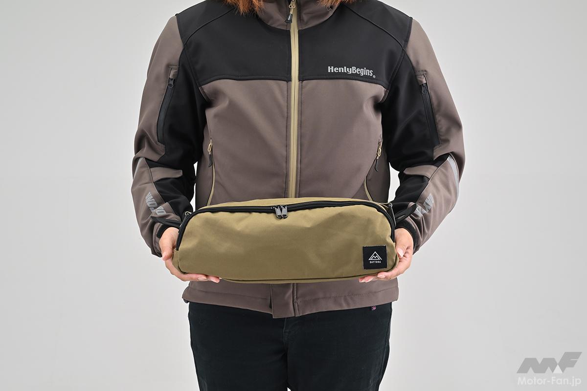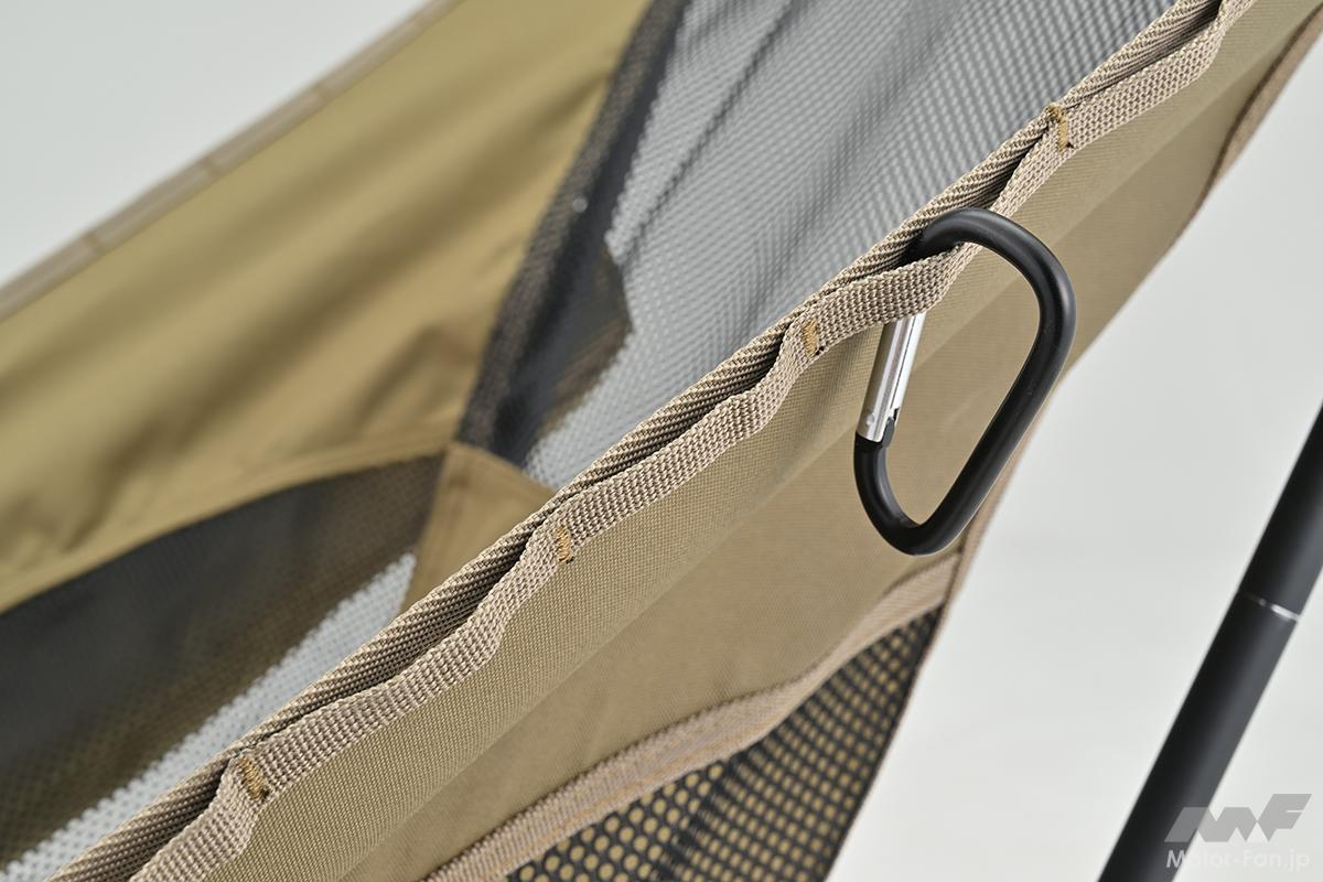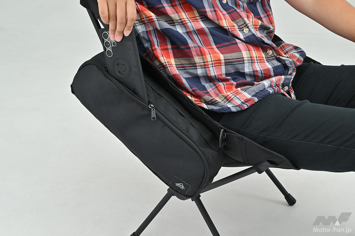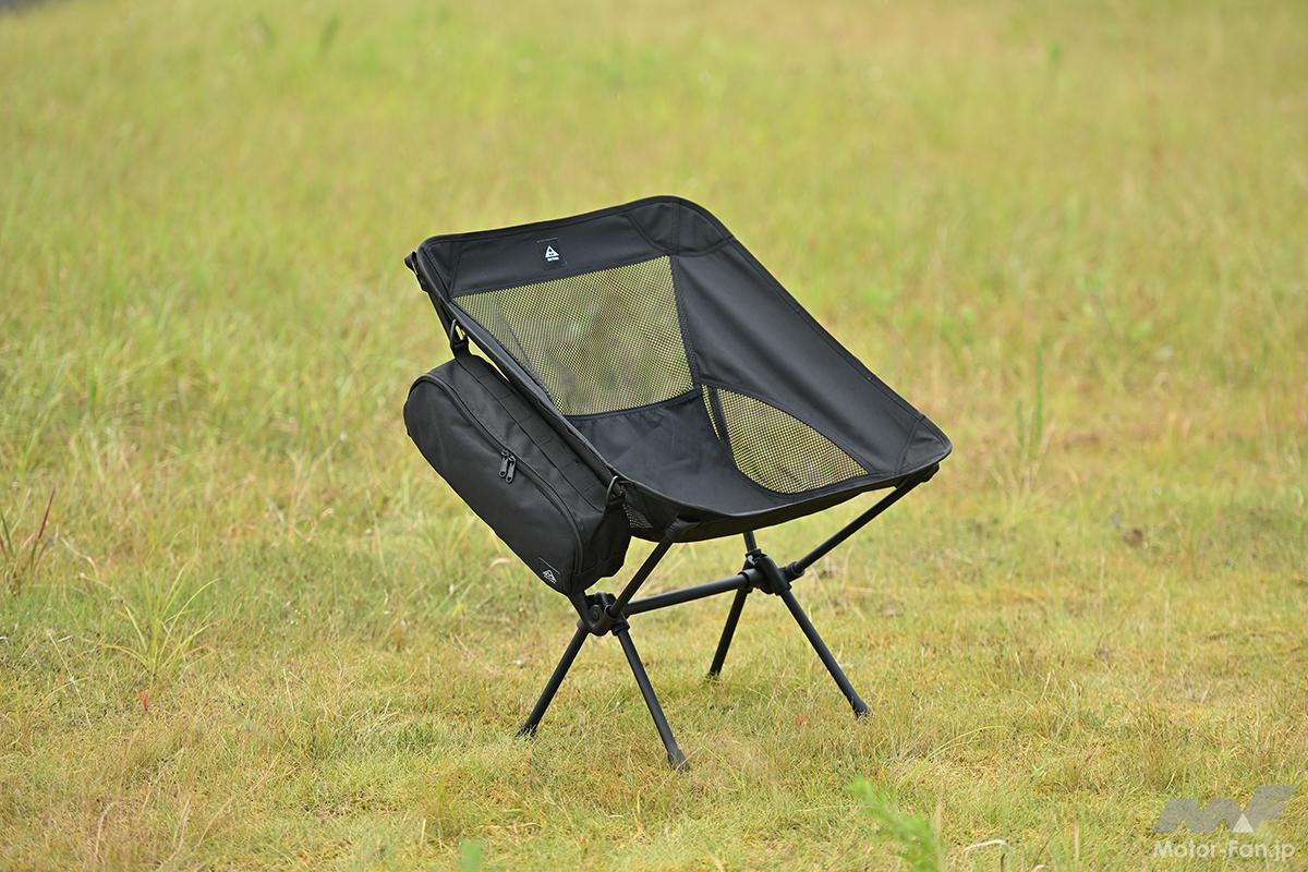 写真は軽量コンパクトながら、快適な座り心地を確保したコンパクトアウトドアチェア。両サイドにはパルステープが装備されており、収納袋を小物入れとして利用可能。「ヘンリービギンズ」のシステムポーチの取り付けもOKだ。
