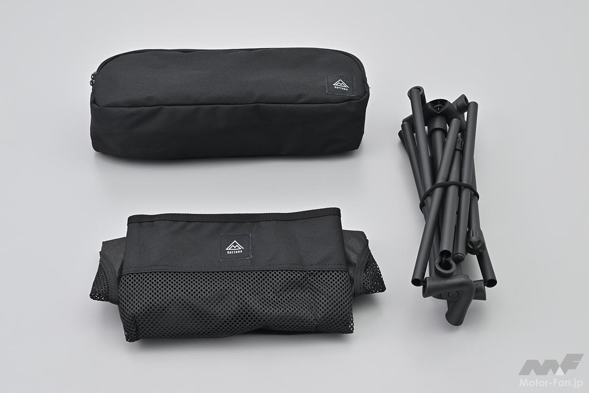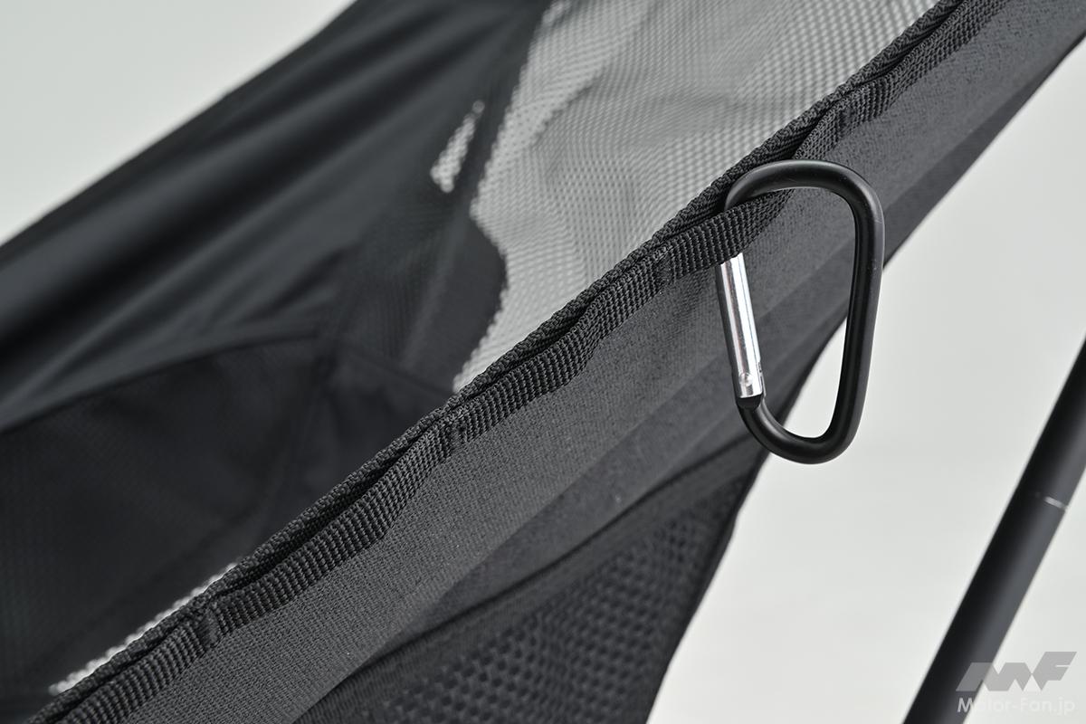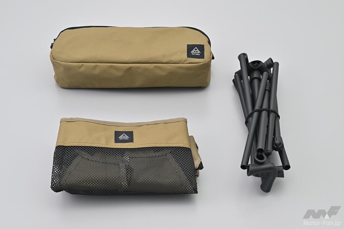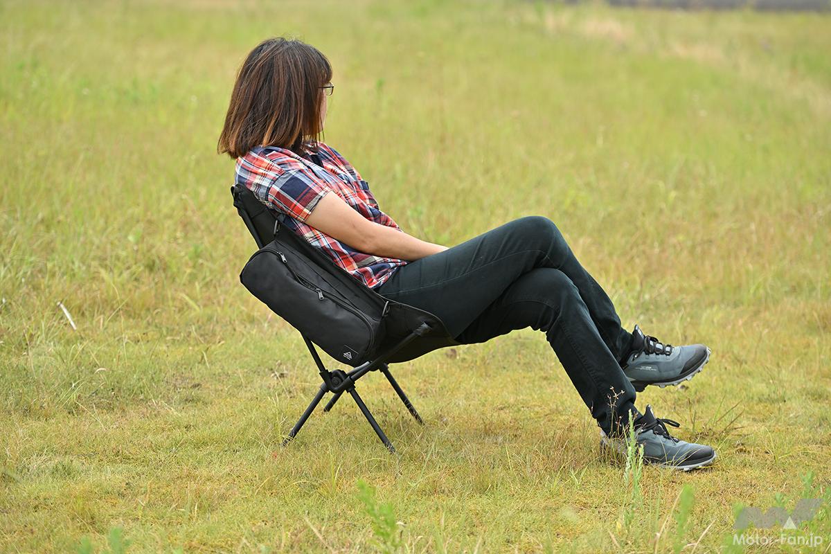 コンパクトアウトドアチェアMILには引っ張りループが装備されており、組み立ても簡単。バイクキャンプを想定した設計により、軽量コンパクトに収納可能。GIVIのサイドケースに収納することもできる。シートバックやザックの底辺にも積載OKだ。
