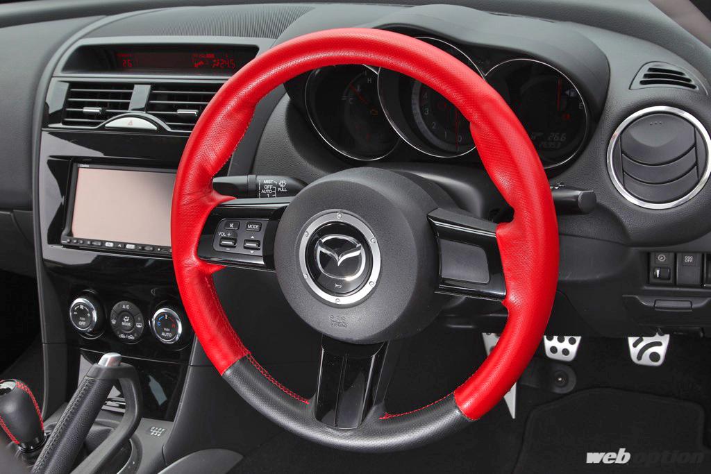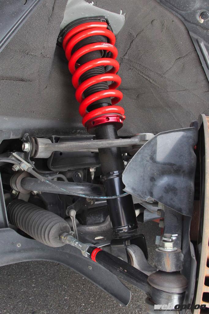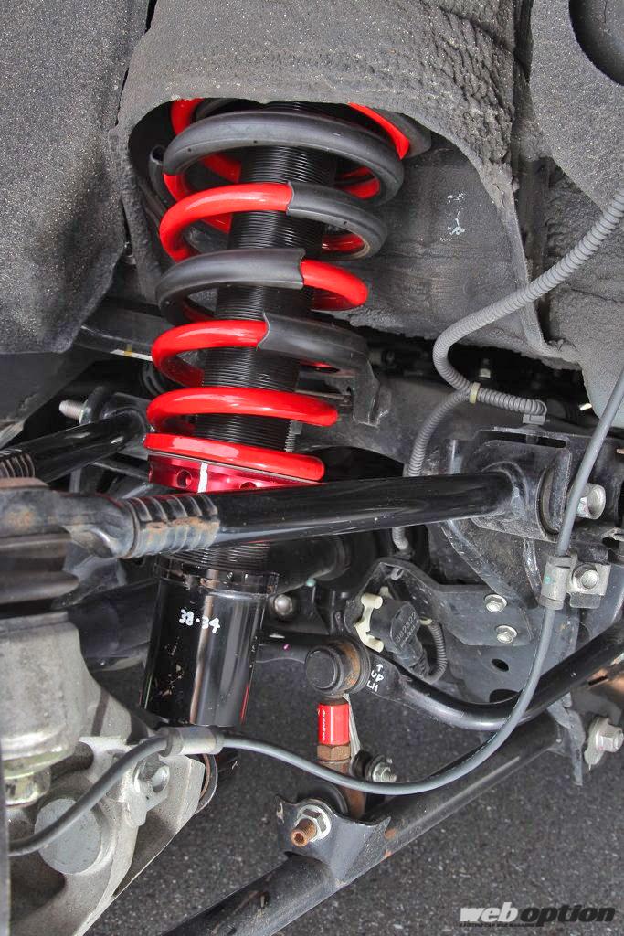 足回りはRX-8用としては3作目となる車高調キットをインストール。スポーツ性能を高めつつ、ラバー製マウントを使うなど快適性を優先。全長調整式、減衰力20段とセッティング幅も広い。