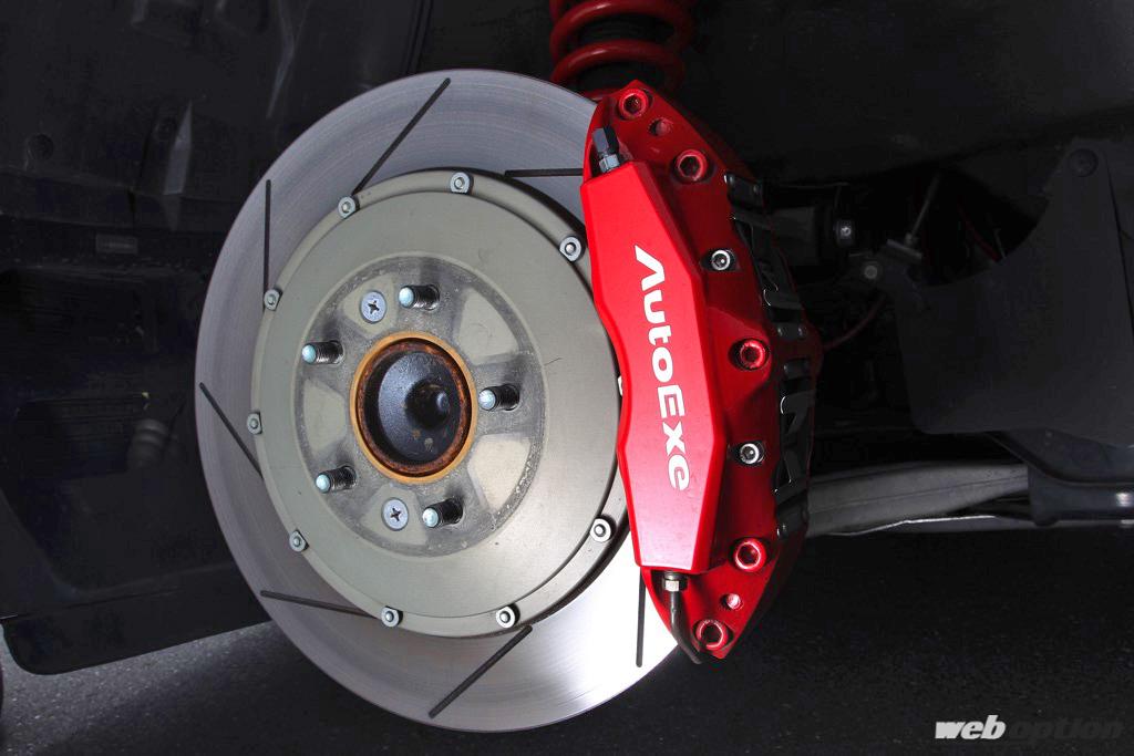 ブレーキチューンも抜かりなく、フロントには対向4ポットキャリパーと355mmローターを装着。キャリパーは鍛造製で剛性も高く、コントローラブルな制動フィールを得ることができる。
