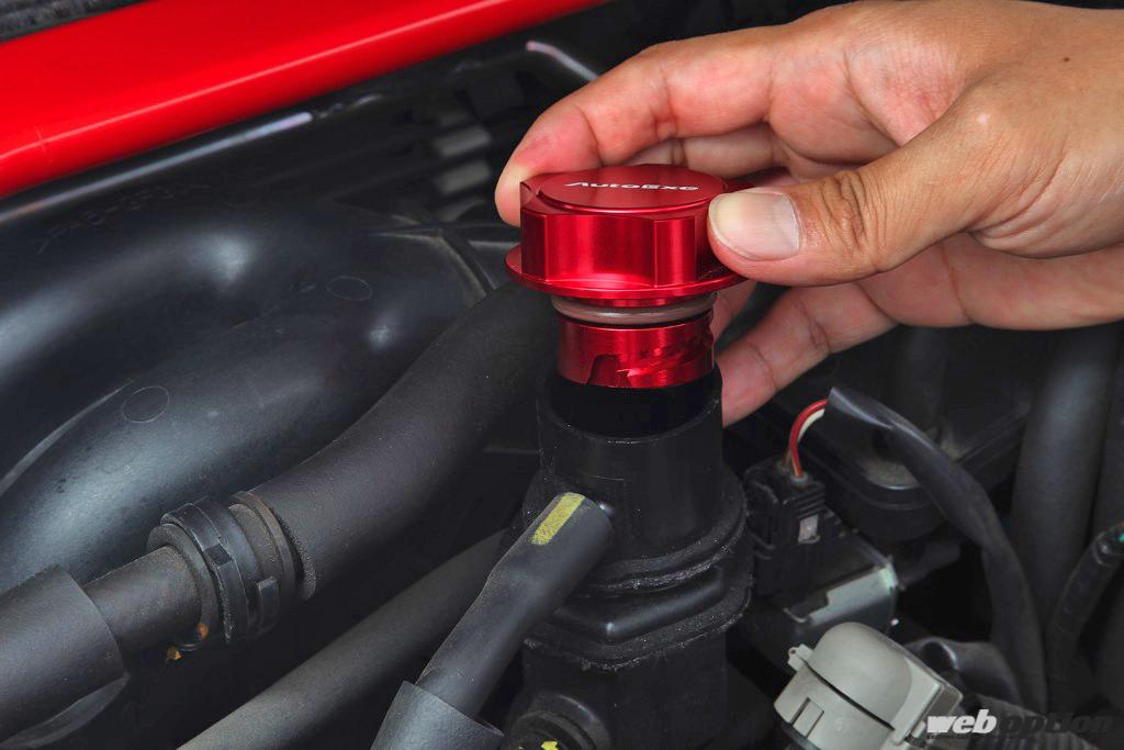 エンジン系は、純正エアクリーナーボックスを活用して吸入効率を高めるスポーツインダクションボックス、吸気抵抗を低減するインテークサクションキットで吸気チューンを敢行。オイルフィラーキャップは前期型用のネジ式と後期型用のワンタッチ式を設定する。