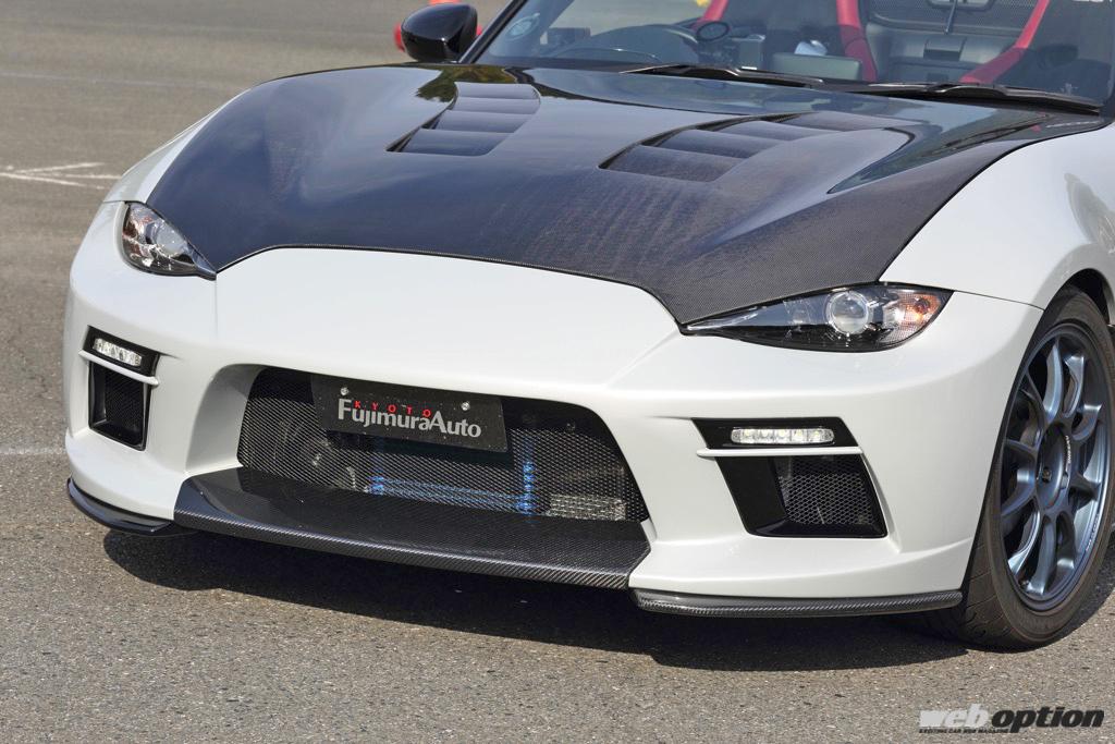 エアロボンネットは武骨になりすぎないように、左右にバランスよくダクトを配列。軽量設計も魅力のひとつで、純正アルミの10.4kgに対してカーボン+FRPモデルは8.2kgを達成している。また、オプションでレインプロテクターもラインナップされ「クリップで固定するタイプなので、突然の雨でも安心! 工具を使わずに、素早く簡単に脱着できますよ」と代表の藤村さん。