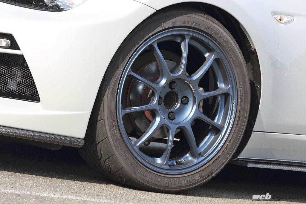 サーキットで高性能ラジアルを履いてテストする機会が多く、ホイールは高い剛性を誇るボルクレーシングZE40を選択。サイズは7.5J×17+38を選び、取材時は215/45R17のアドバンネオバAD08Rと組み合わせていた。