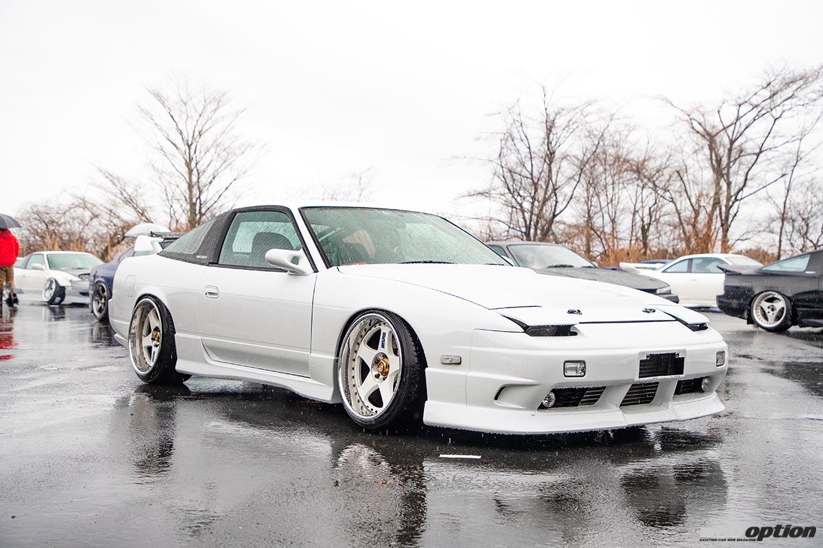 美しい純ベタ仕様の180SXを発見。ホイールはニスモLM GT2ベースのリバレルで圧巻のディープリムを演出している。半目で固定されたリトラクタブルヘッドライトが当時の空気感を漂わせる。