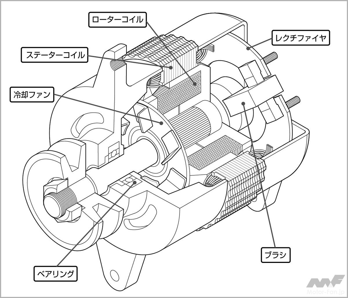 オルタネーターには前後二つもしくは前方にファンがあり、ローターコイルと一緒に回転してオルタネーターを冷やしている。発電すると熱を発するのと共に、エンジンルーム内にあるために冷却が必要。 ベアリングはローターコイルを支えていると共に、ローターコイルとステーターコイルの隙間が0.5㎜ほどのため、ローターコイルの回転精度も出している。この隙間が出力に大きな影響を与える。