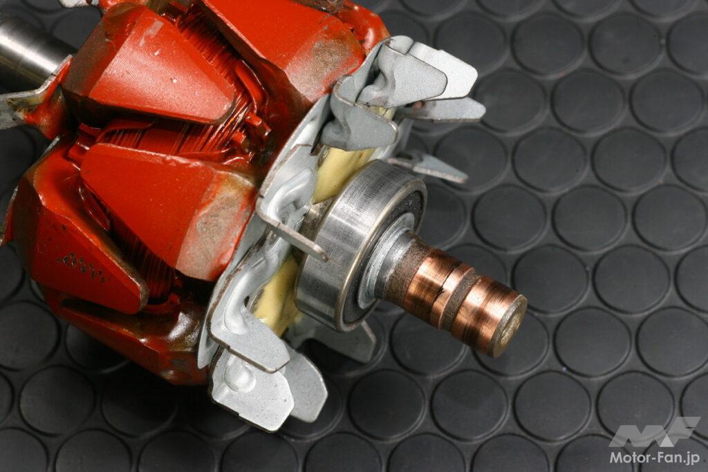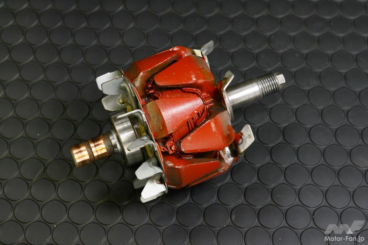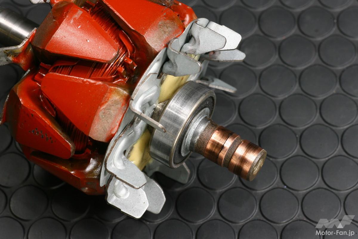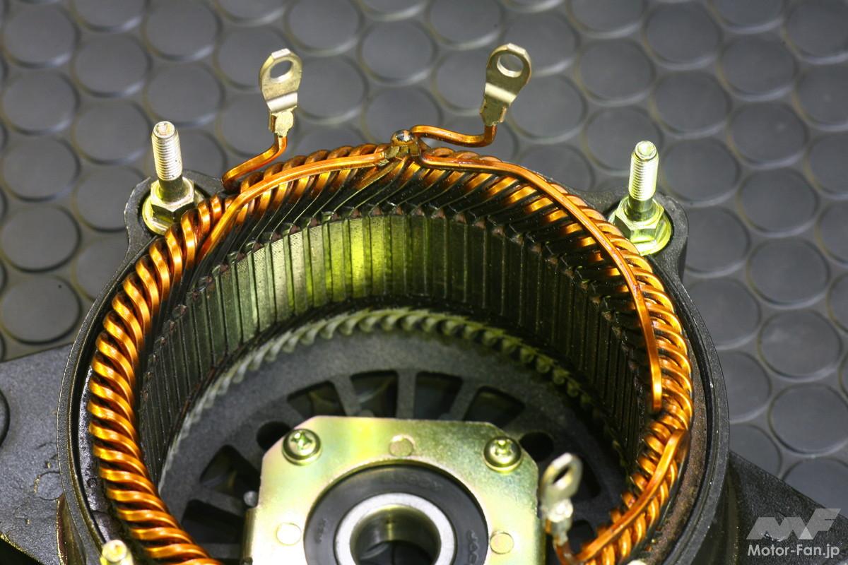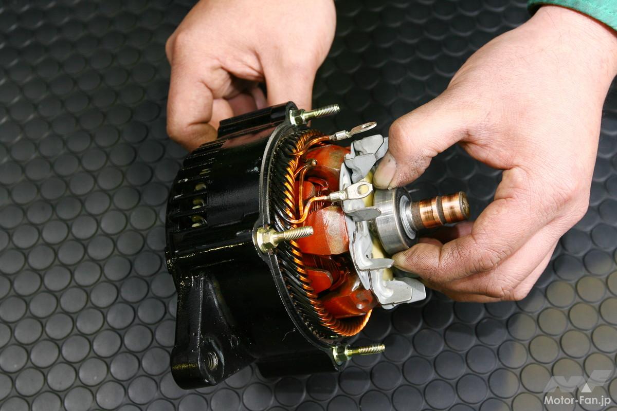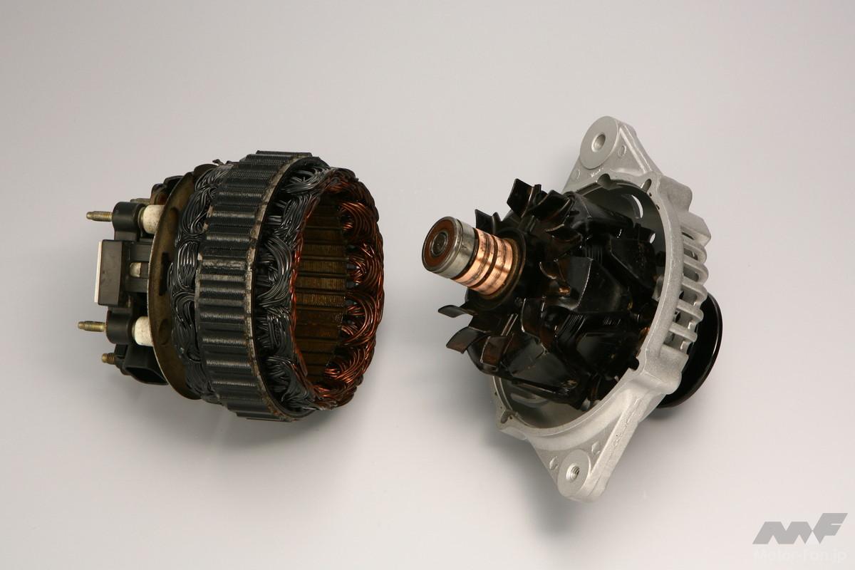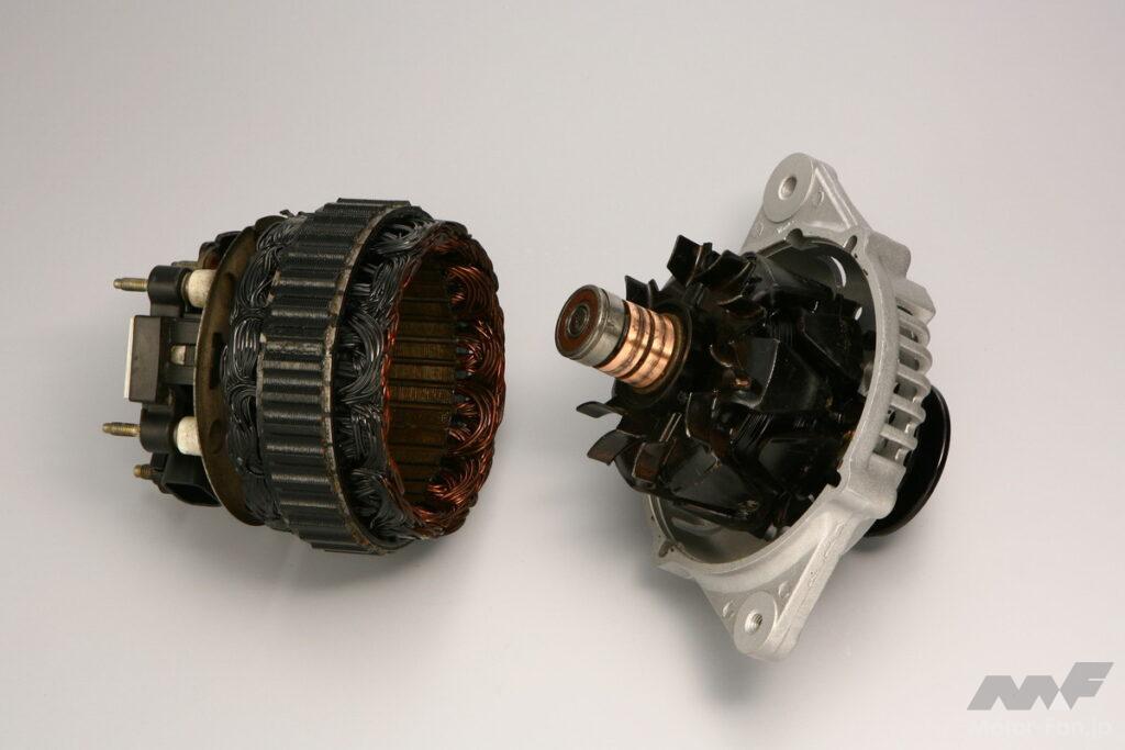 ステーターコイルは、それぞれに独立した3組のコイルが薄い鉄板を重ねたステーターコアを貫通して巻かれ、それぞれのコイルが交流電流を発生する。この方式は三層交流式と呼ばれ、オルタネーターでは一般的なコイルの巻き方だ。その3組のコイルの結線方法にはスター結線(Y結線)とデルタ結線(△結線)があるが、オルタネーターのほとんどがスター結線(Y結線)になっている。これは結線が簡単、低速特性に優れている等のメリットがあるからだ。
