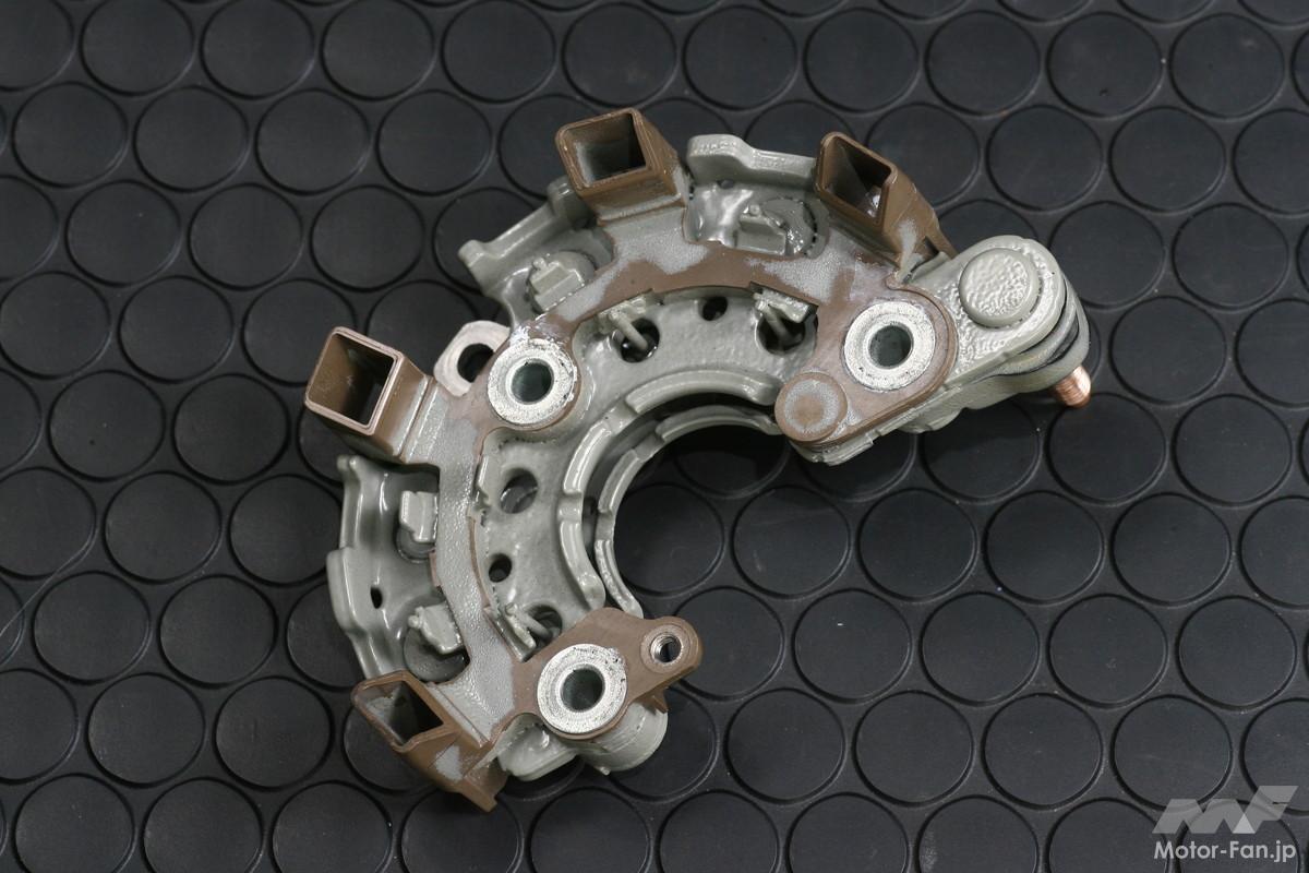 ツェナダイオードを6個または8個配置しており、ステーターコイルで発生した交流電流を直流電流に変換する役割をしていて、ステーターコイルの横に取り付けられる。ツェナダイオードとは順方向にしか電流を流さないダイオードとは違い、ある条件が揃うと逆方向にも電流が流れるダイオードだ。