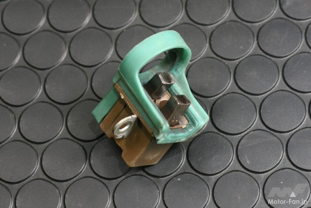 クランクシャフトの回転を受けてローターコイルは回転するので、エンジン回転が上がるとローターコイルの回転も上がり、発生電圧も上昇していってしまう。この上昇した電圧を一定電圧で止めるのがレギュレーターで、ローターコイルへの供給電圧を調整している。